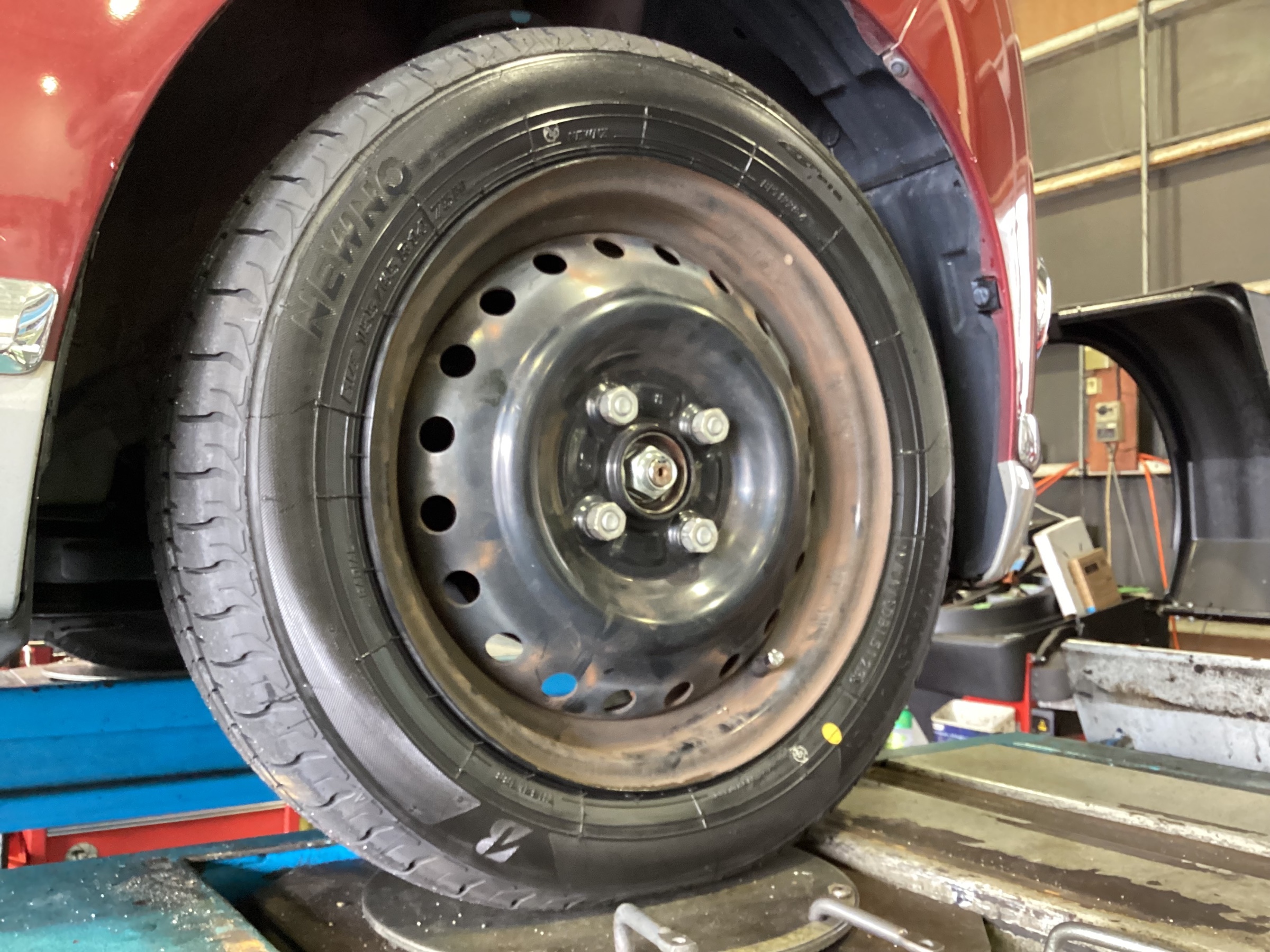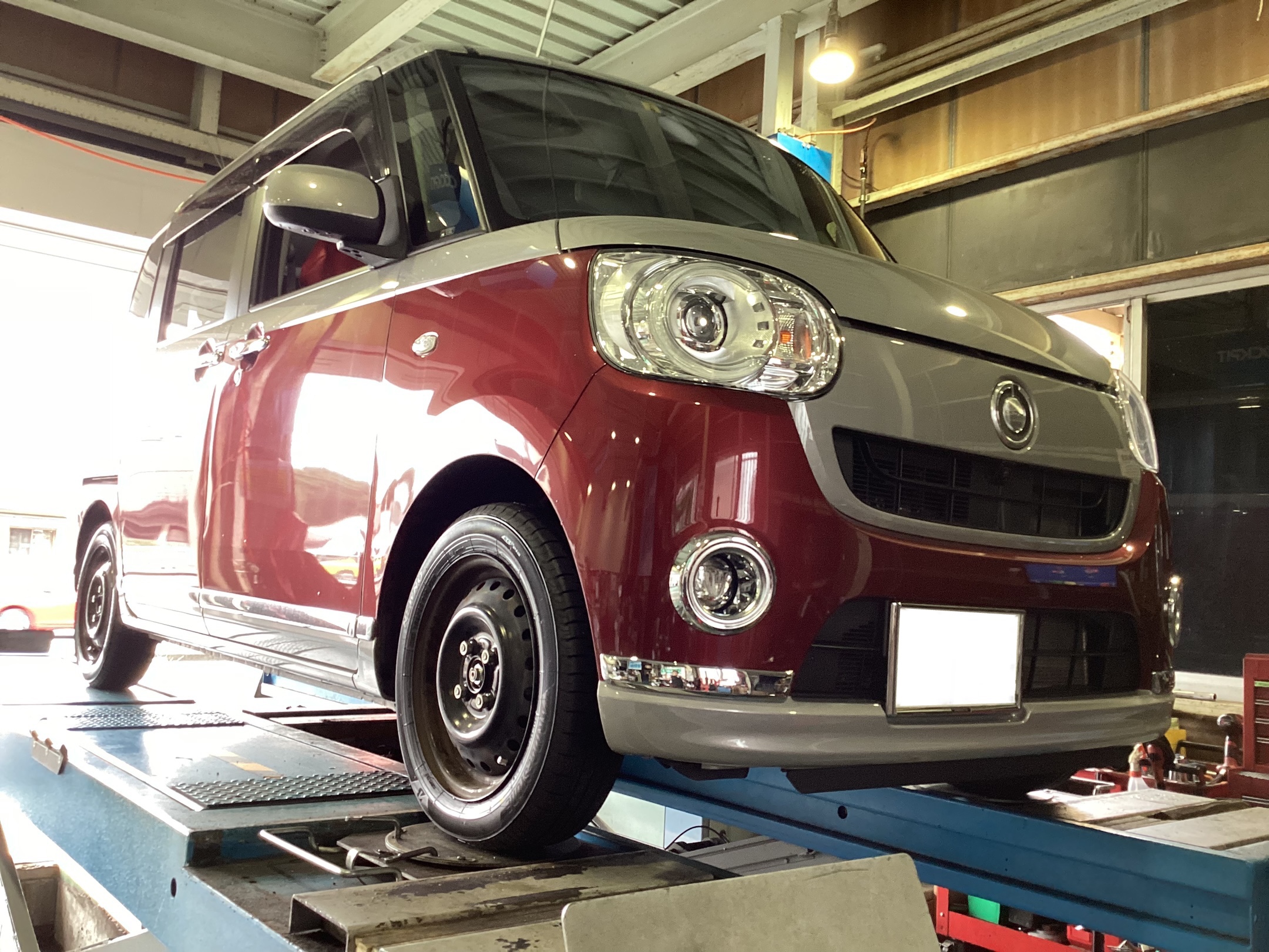 【作業事例】「ダイハツ・ムーヴキャンバス」夏用タイヤ交換作業(ブリヂストン NEWNO)・アライメント調整作業