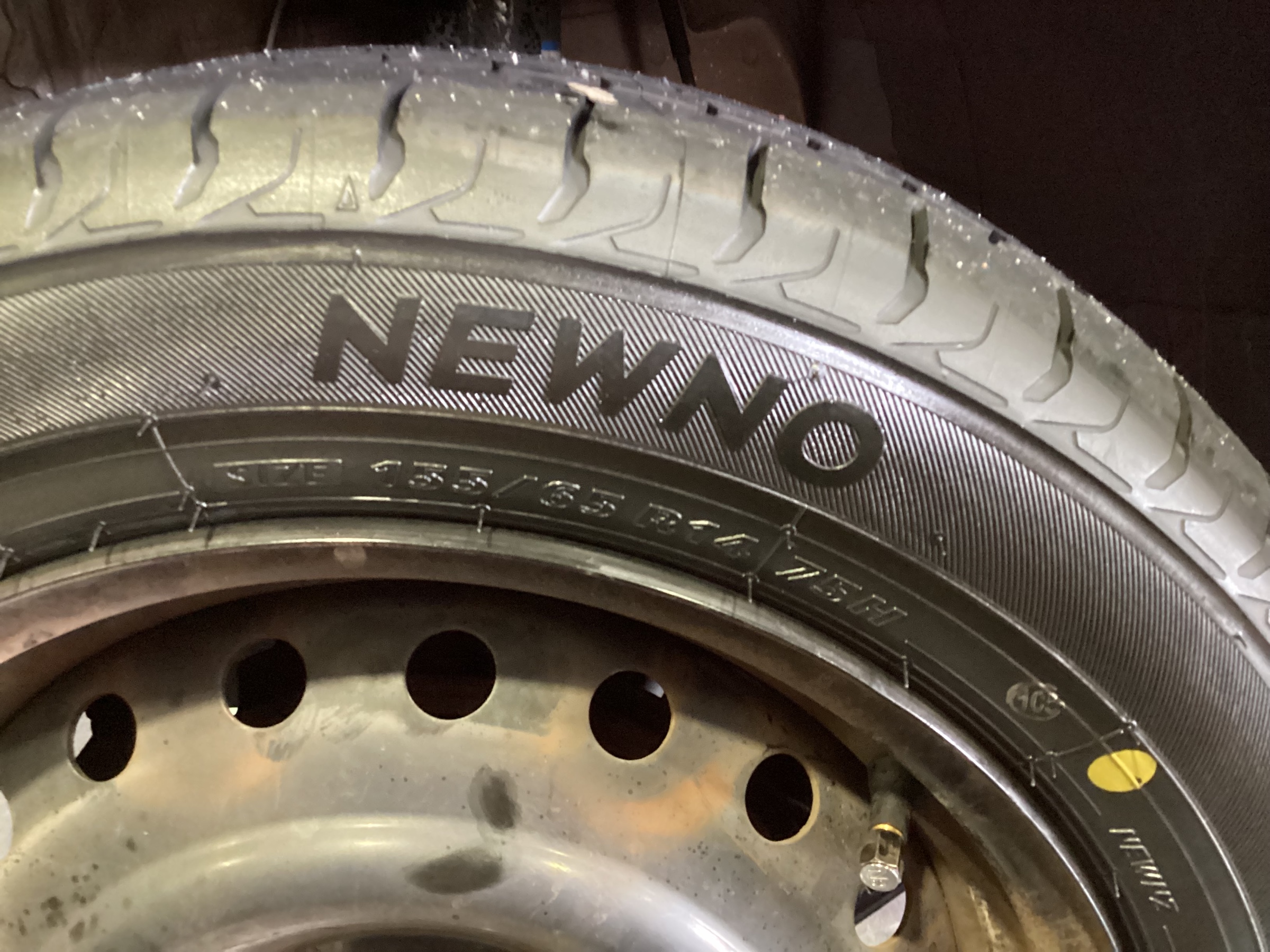 お選びいただいたタイヤが「ブリヂストン NEWNO(ニューノ)」サイズ:155/65R14。最安価のタイヤ以外でなるべく安く済ませたいということで、開催中のセールで特別割引になっているニューノになりました。