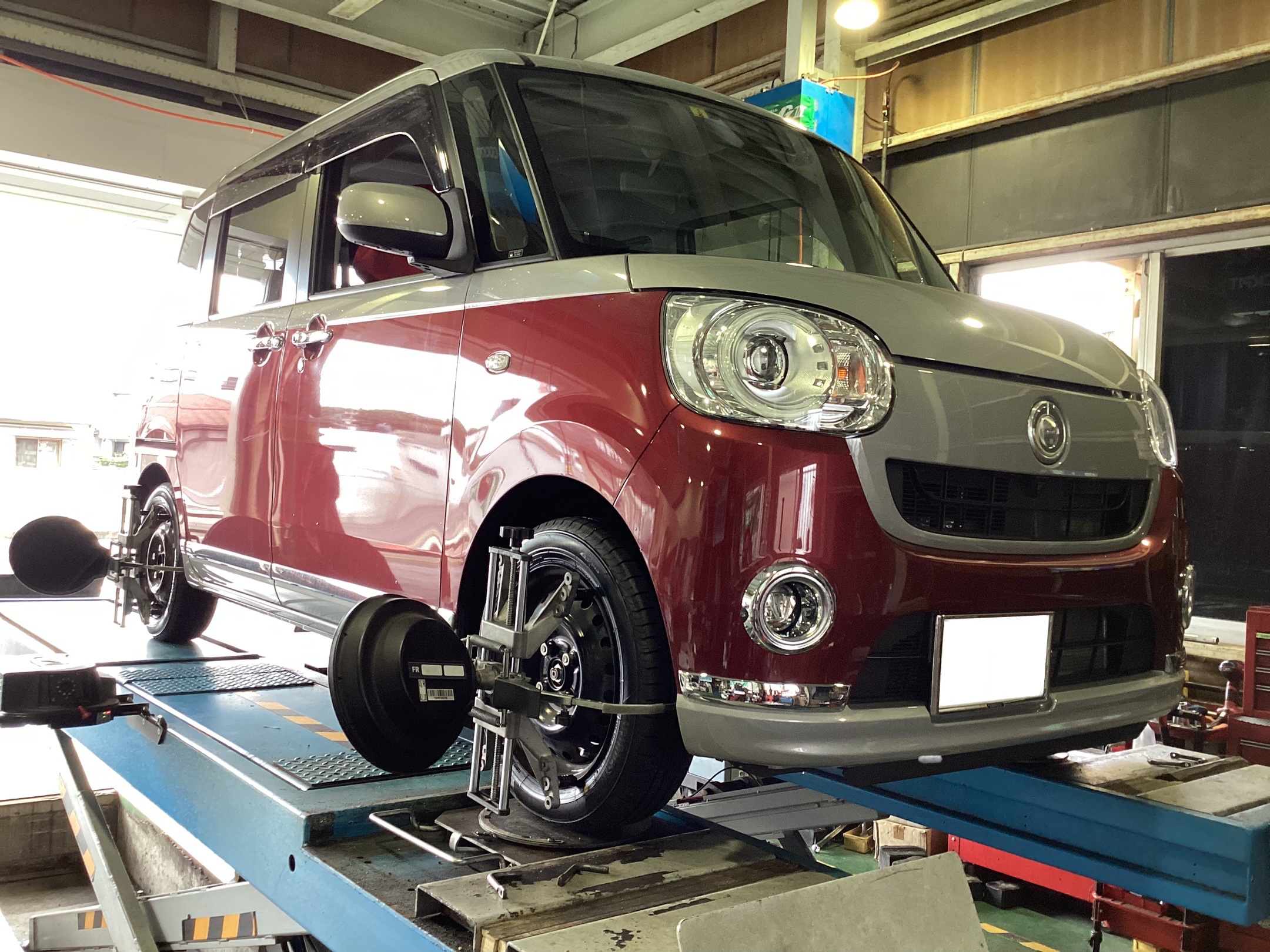 ムーヴキャンバスのタイヤ・ホイールにセンサーを取り付け、タイヤの取付角度のミリ単位の数値を測ります。その数値が自動車メーカーが定める数値の範囲内かそうでないかをチェックします。
