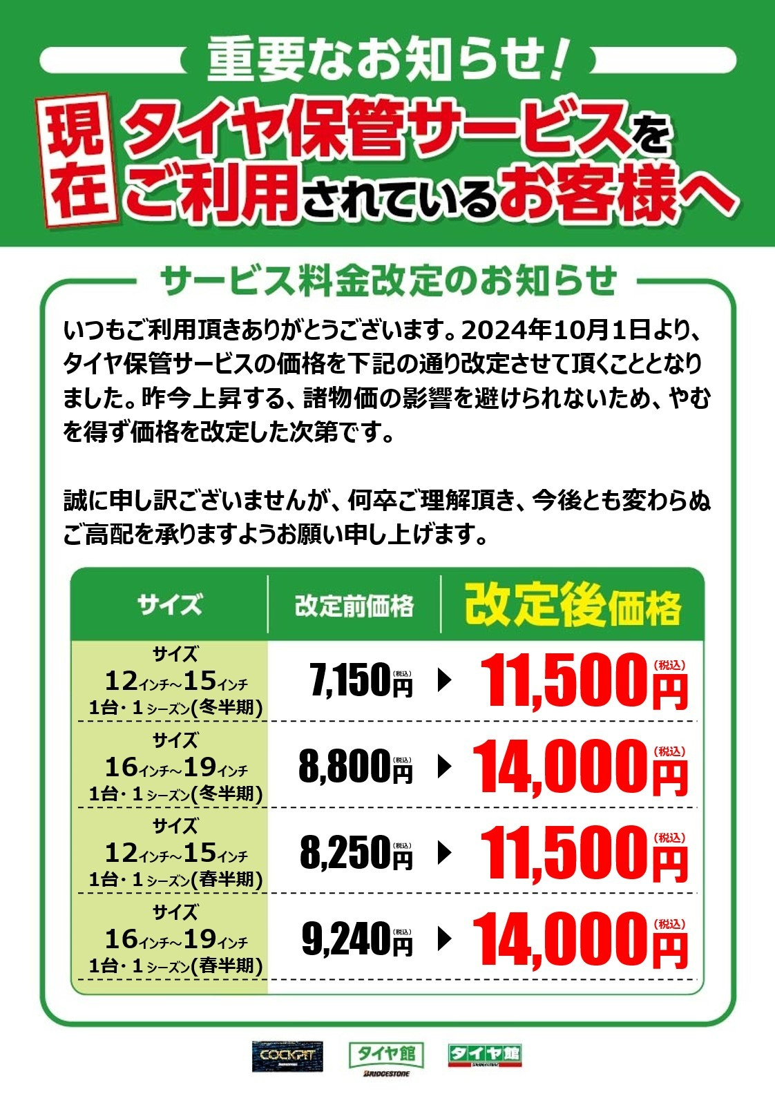 先月よりご案内しています通り、タイヤ保管料金が改定されました。