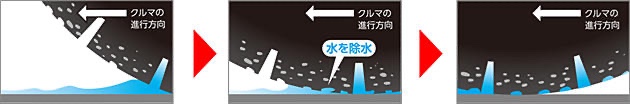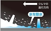 これに加えて、ブロックの先端に突起を設けることで縦方向の溝からブロック周りの横方向の溝への水の回り込みを抑制する「L字ブロック」や、サイプと呼ばれる細い溝の一部の端を貫通させないことでサイプ内への余計な水の侵入を抑制する「端止めサイプ」を採用した「新トレッドパタン」により、水流の動きをコントロール。タイヤ接地面への水の侵入を抑制し、タイヤが路面をしっかりグリップ出来るようにしています。