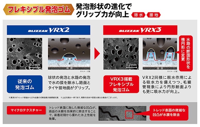 タイヤの内部に無数の「気泡」と「水路」を有したゴムです。今回「BLIZZAK VRX3」ではこの発泡ゴムが「フレキシブル発泡ゴム」に進化。水路の断面形状を従来の円形から楕円形に変更することで「毛細管現象」による吸水力向上を実現し、氷上グリップが大幅に向上しました。