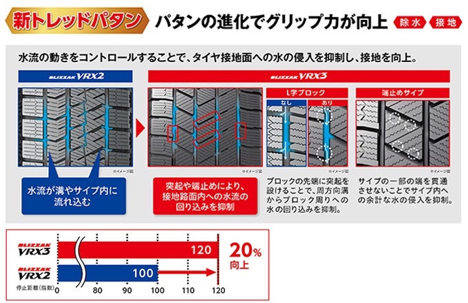 「BLIZZAK VRX3」は、これらの技術を採用することで、従来品(VRX2)対比氷上でのブレーキ性能を20%向上しています。