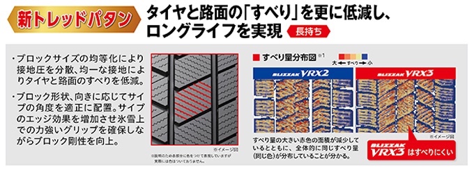 「BLIZZAK VRX3」の「新トレッドパタン」は長持ちにも大きく貢献しています。ブロックサイズの均等化により局所的な接地圧の集中を抑制し、均一な接地ですべりを低減。