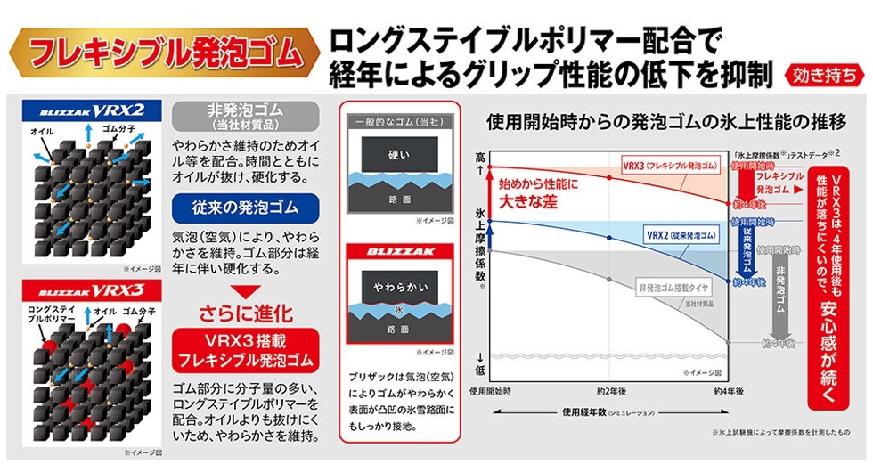 しかし、時間が経っても無くならない気泡と異なり、オイルは徐々にゴムから抜け出していきゴムの硬化を招いてしまいます。さらなる「効き持ち」を追及して、「BLIZZAK VRX3」はオイルよりも抜けにくい新素材「ロングステイブルポリマー」を発泡ゴムに配合することで、ゴムの柔らかさをさらに持続させ、氷上性能が低下することを抑制。高い氷上性能が長く続く「効き持ち」を向上しています。