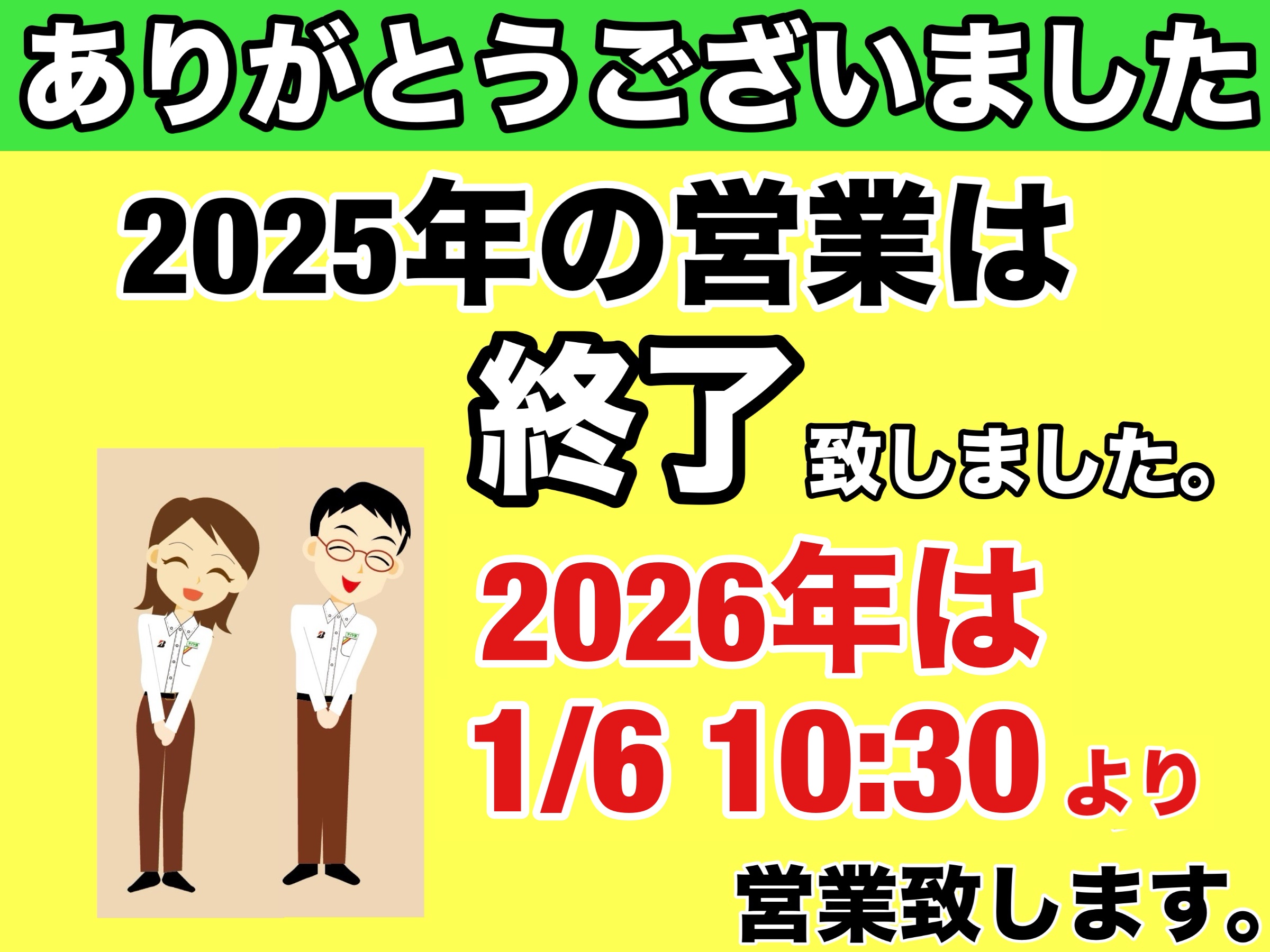 新年あけましておめでとうございます。 昨年、ご来店のお客様には、多大なるご愛顧、誠にありがとうございました。 2026年体制に変更があり、約6年店長として勤務していました植村から、名古屋のタイヤ館勤務の柳瀬に代わります。 今年も変わらぬご愛顧の程、どうぞ宜しくお願い申し上げます。 2026...
