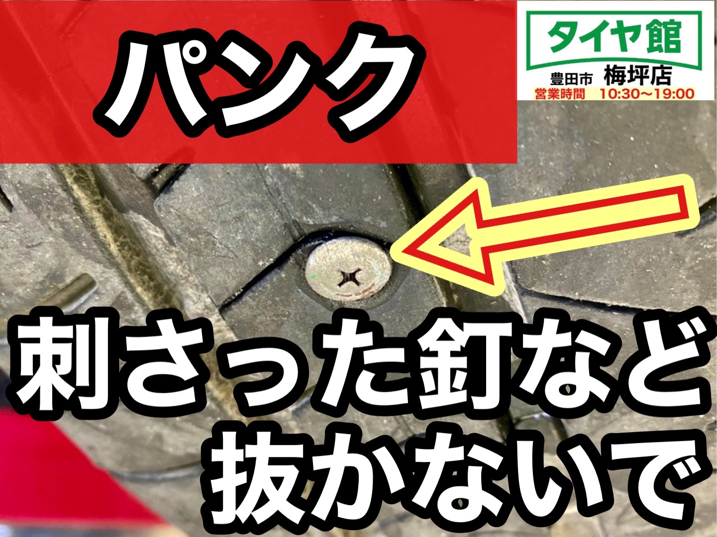 パンク修理はタイヤ館梅坪店へ『タイヤに刺さったクギなどは抜かないで』
