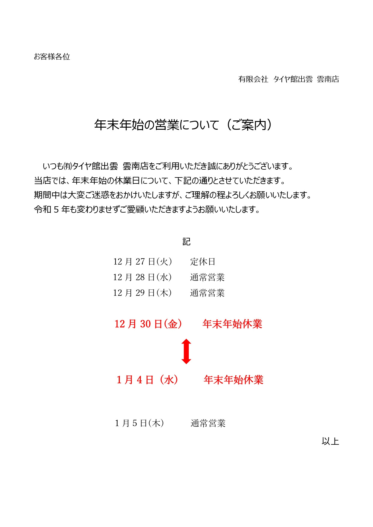 年末年始のお休みについてのお知らせ ポスト 2022年12月16日 タイヤ館雲南ホームページをご覧いただきありがとうございます。 年内の営業は12月29日(木)までとなります。 12月30日~1月4日までお休みとさせていただきます。 年明けの営業は1月5日からとなりますので、ご不便をおかけしますがよろしくお願いいたします。 カテゴリ:お知らせ