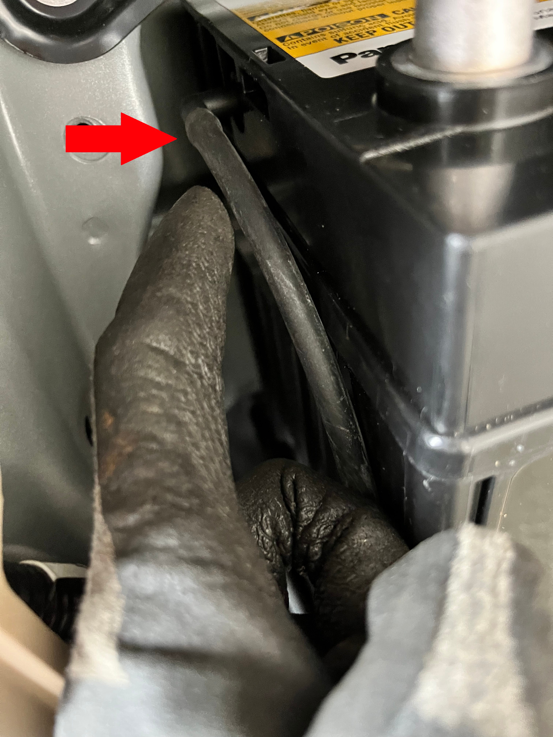 特に注意が必要なのがこのホース。通常の車には付いていませんが、車内にバッテリーが積んである車の場合このようなホースが付いています。このホースはバッテリーから発生する水素ガスを車外に逃がす為のホースです。これをつなぎ忘れると車内に水素ガスが溜まりとても危険です!!