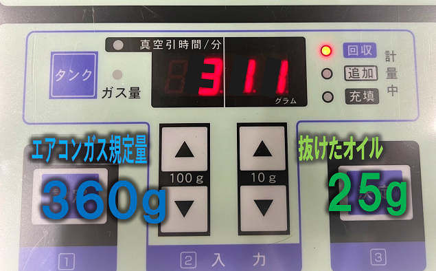この車は360g入ってないといけませんが、ガスが311gとオイルが25gが抜けました。
