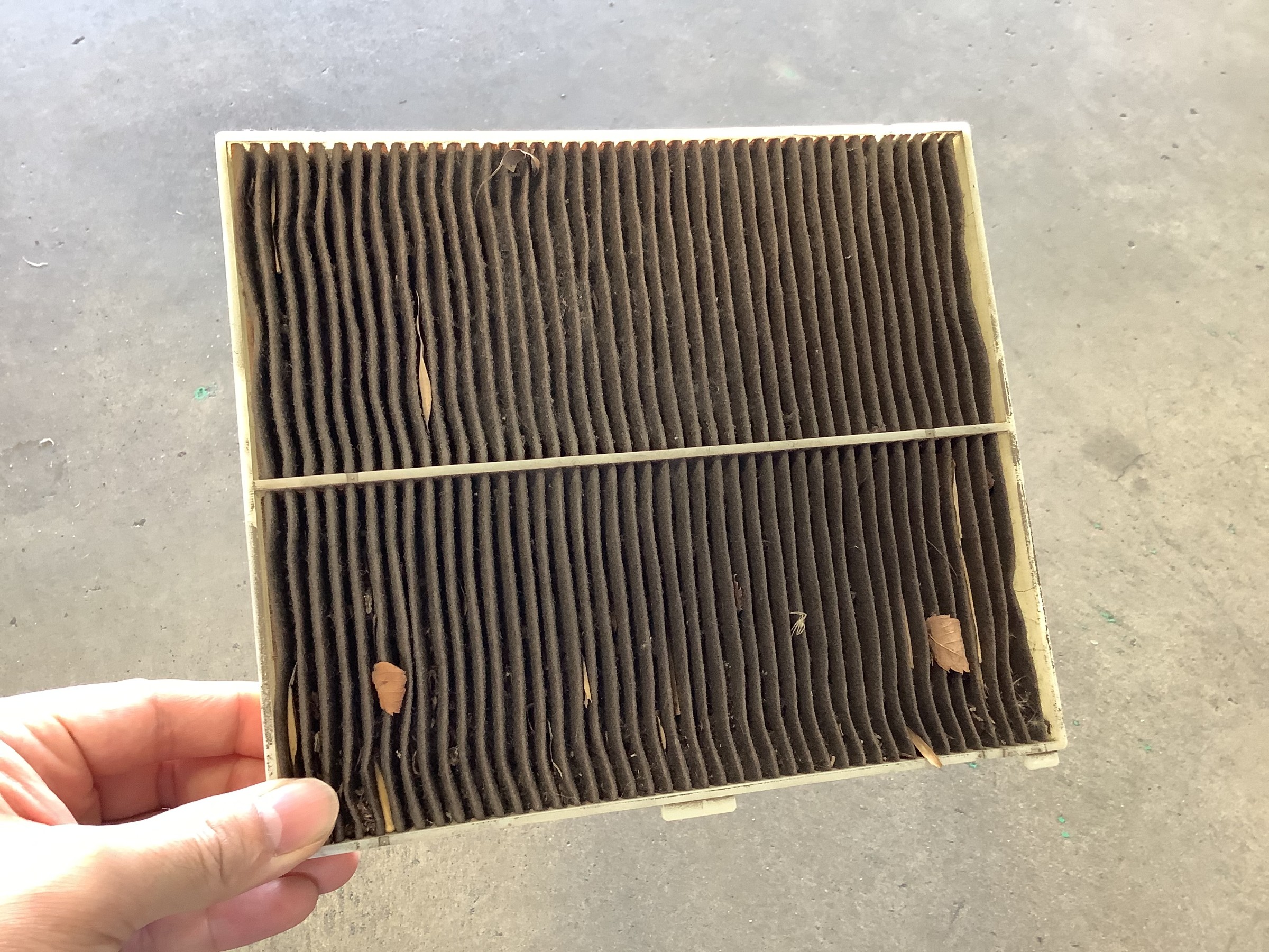フィルターにホコリや汚れがかなりついていました。こんなに詰まったフィルターは久しぶりに見ます( ゚Д゚) この状態だと風量も少なくなりますし、この汚れたフィルターを通った空気が車内に出てきます。目には見えない菌やウィルスが飛んでいるかもしれません。