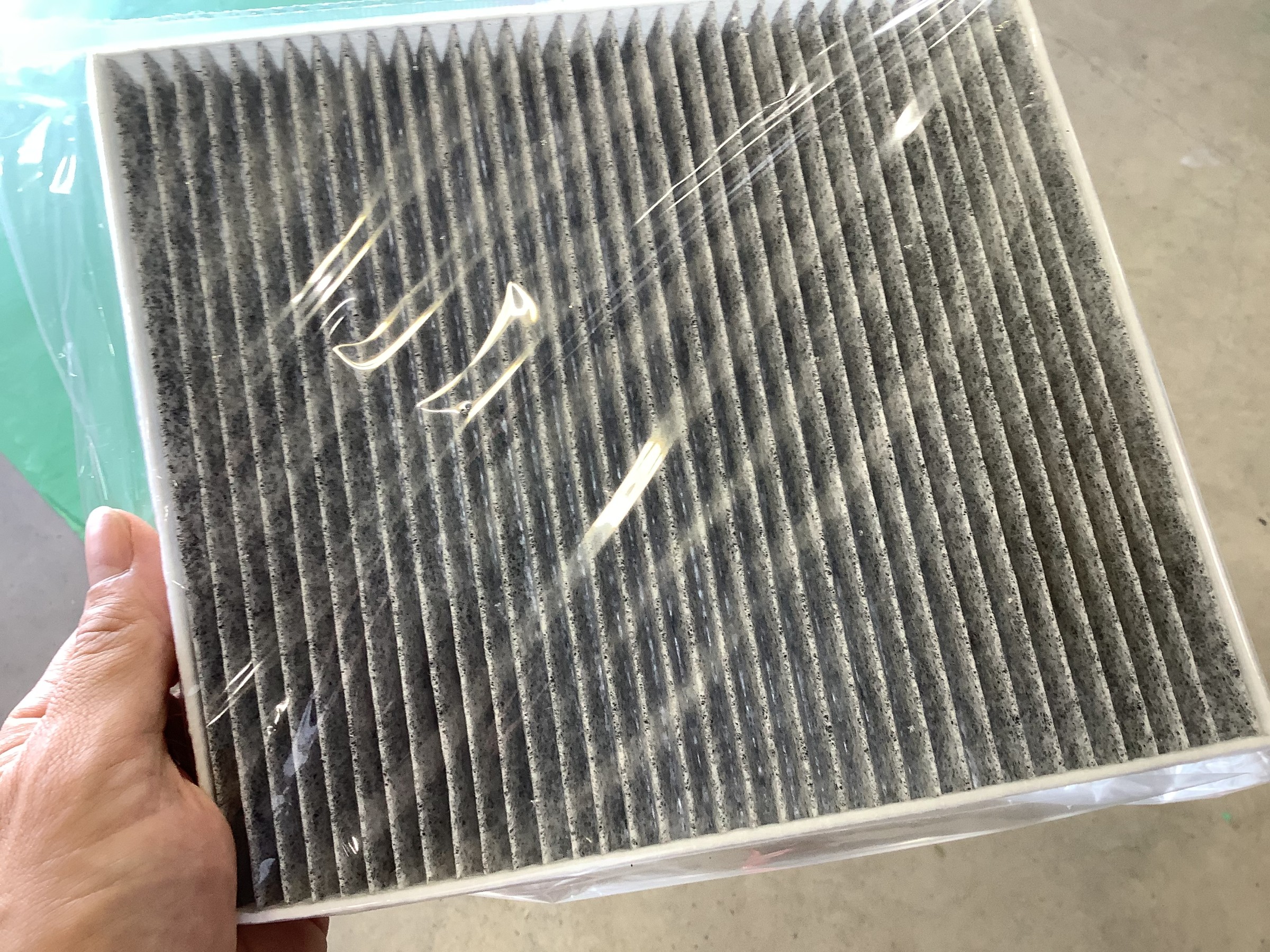 今回交換したフィルターは生地に活性炭が入っているもので、消臭抗菌の効果があります。効果は約1年です。毎年点検して状態見られるといいと思います。
