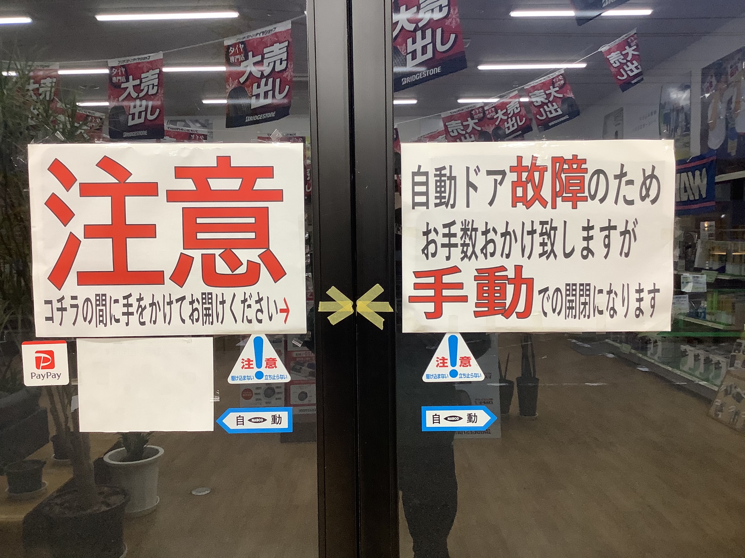 自動ドアが故障しております。 ポスト 2025年1月31日 こんにちはタイヤ館雲南です。 寒さのせいか入り口の自動ドアが故障してしまいました。 ご迷惑をおかけいたしますが、しばらくの間は手動で開けていただくようになります。 日によっては動く時もありますが調子が安定しませんので、ドアにぶつからないようご注意ください。 修理につきましては2月の早いところでお願いはしておりますが、暫くの間ご不便をおかけいたします。