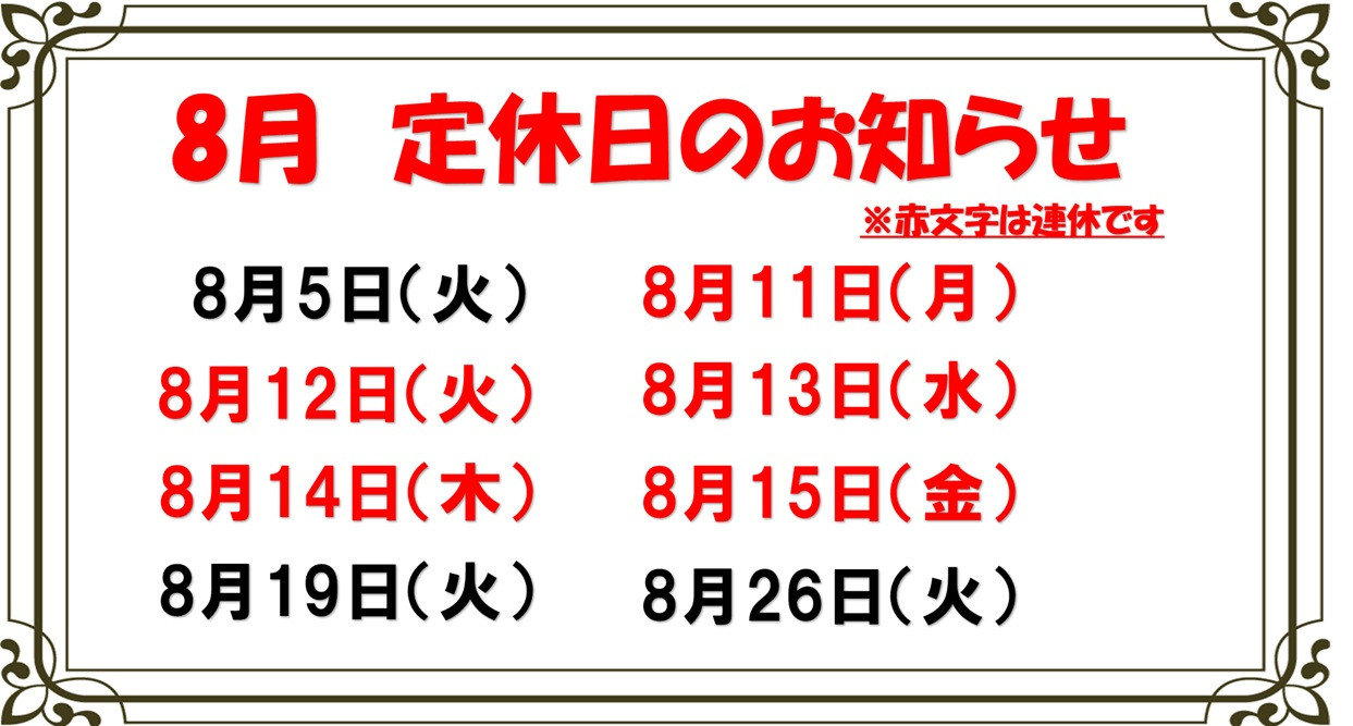 8月 定休日のお知らせ ポスト 2025年7月31日 タイヤ館雲南ホームページをご覧いただきありがとうございます☆ 8月の定休日のお知らせです(^^♪ 毎週火曜が定休日となります。合わせまして8月は連休がございます。 8月11日(月)~8月15日(金)は連休になります