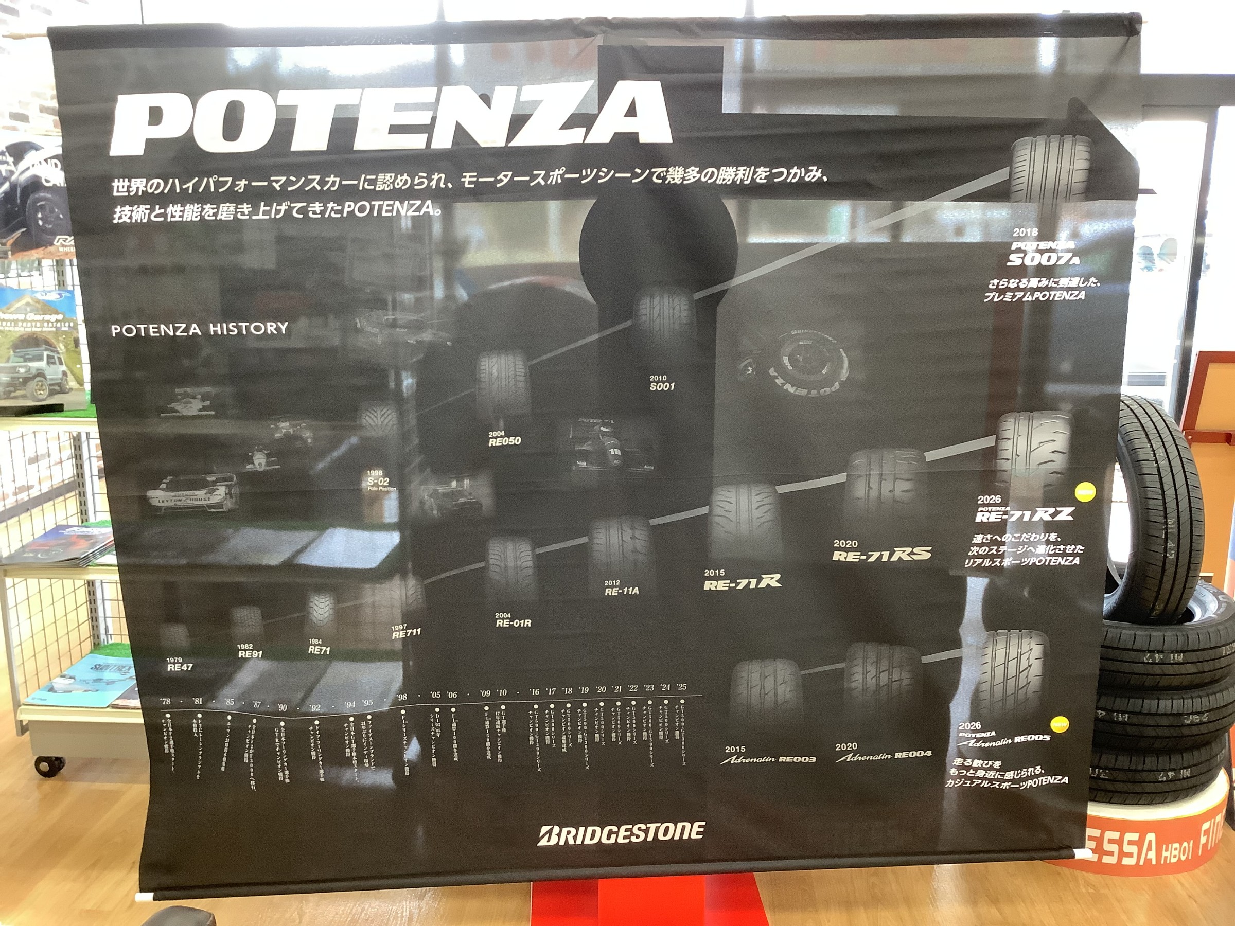 POTENZAの歴史展示中(^^v ポスト 2026年2月21日 こんにちはタイヤ館雲南です。 ブリヂストンのスポーツタイヤ「POTENZA」(ポテンザ)の歴史タペストリーが展示中です! 現行のモデルに至るまでの遍歴が見ることができます。 私自身知らないモデルがあったりトレッドパターンの変化も見れて興味がある方には面白い展示になっておりますので是非ご覧ください。 昔履いていたモデルもあるかもしれませんよ(^^♪