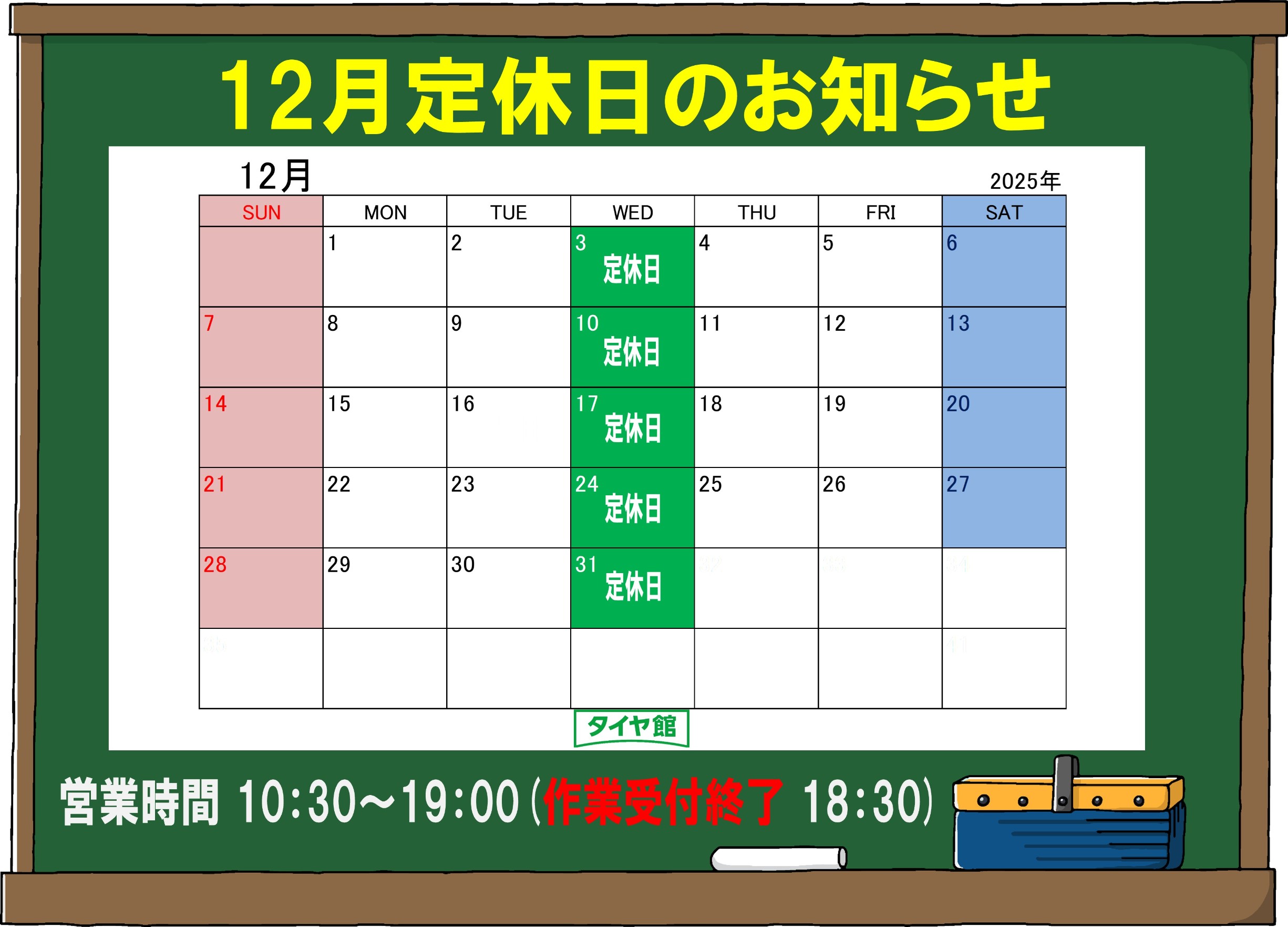 10:30~19:00 (※作業受付は18:30までですが状況により早めに打ち切らせていただく場合がございます。)
