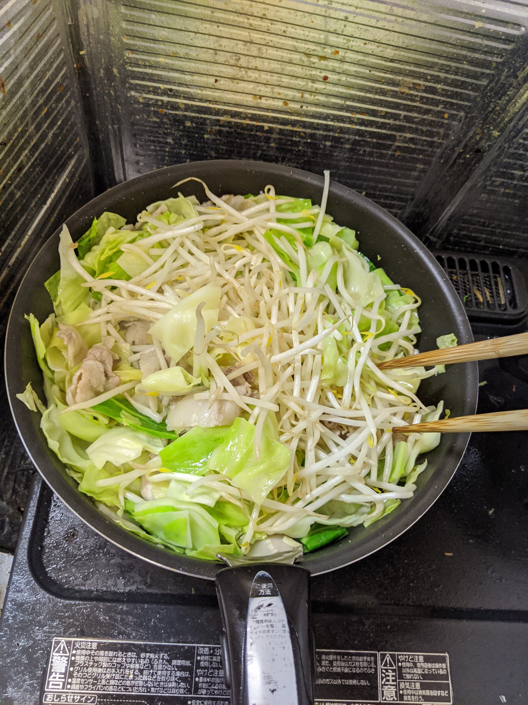 モヤシもキャベツも、炒めるとガッツリ量が減るので、意外にも無理のないバランスになりました。