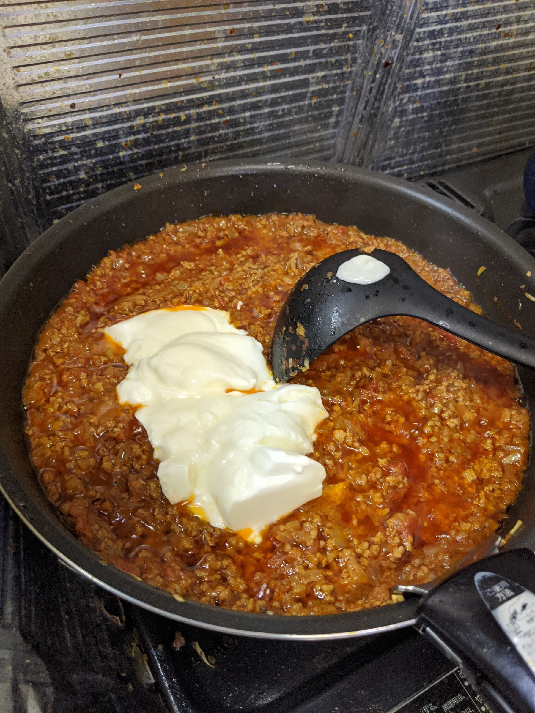 しばらく煮詰めて水分が飛んだら、次は塩とヨーグルトを投入します。