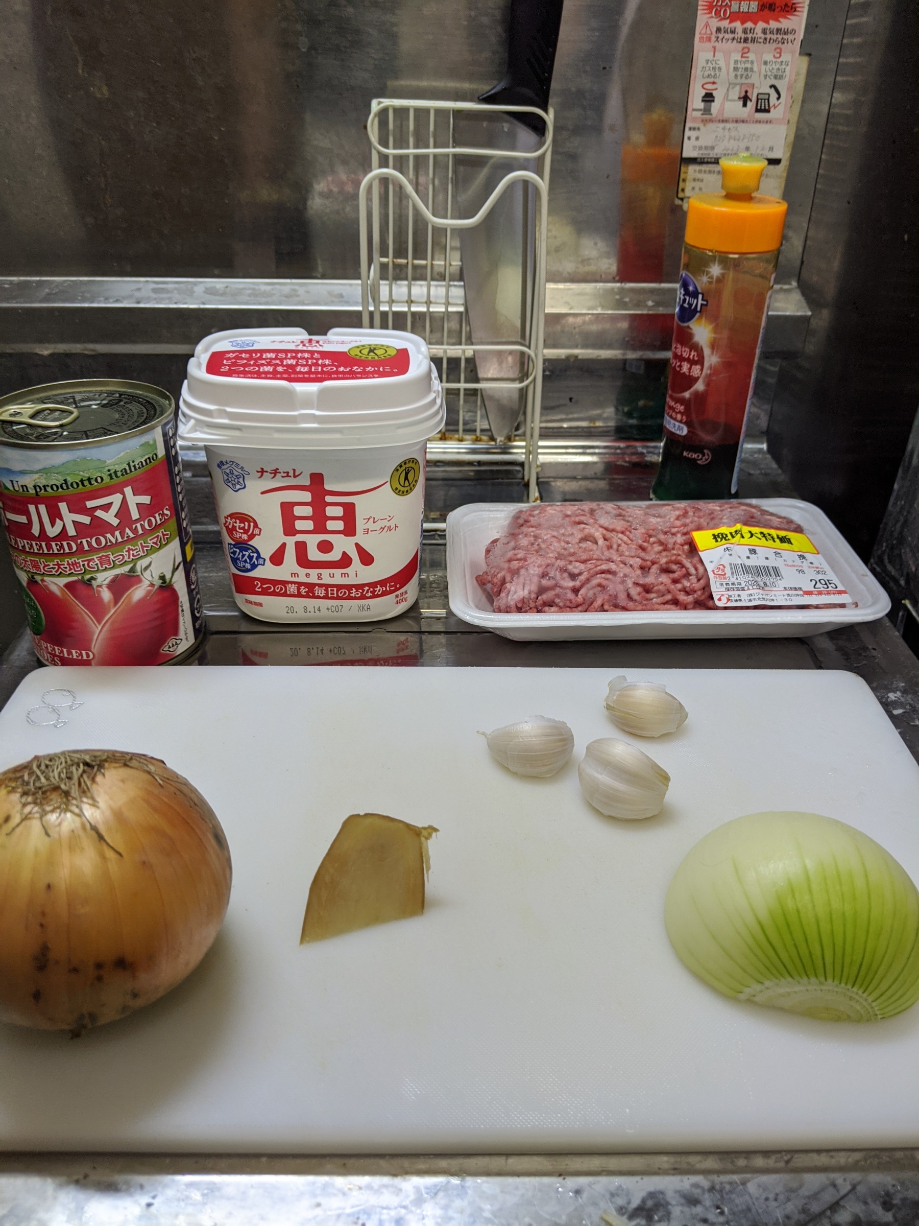 玉ねぎとニンニクと生姜、挽き肉とトマト缶とヨーグルトを使います!