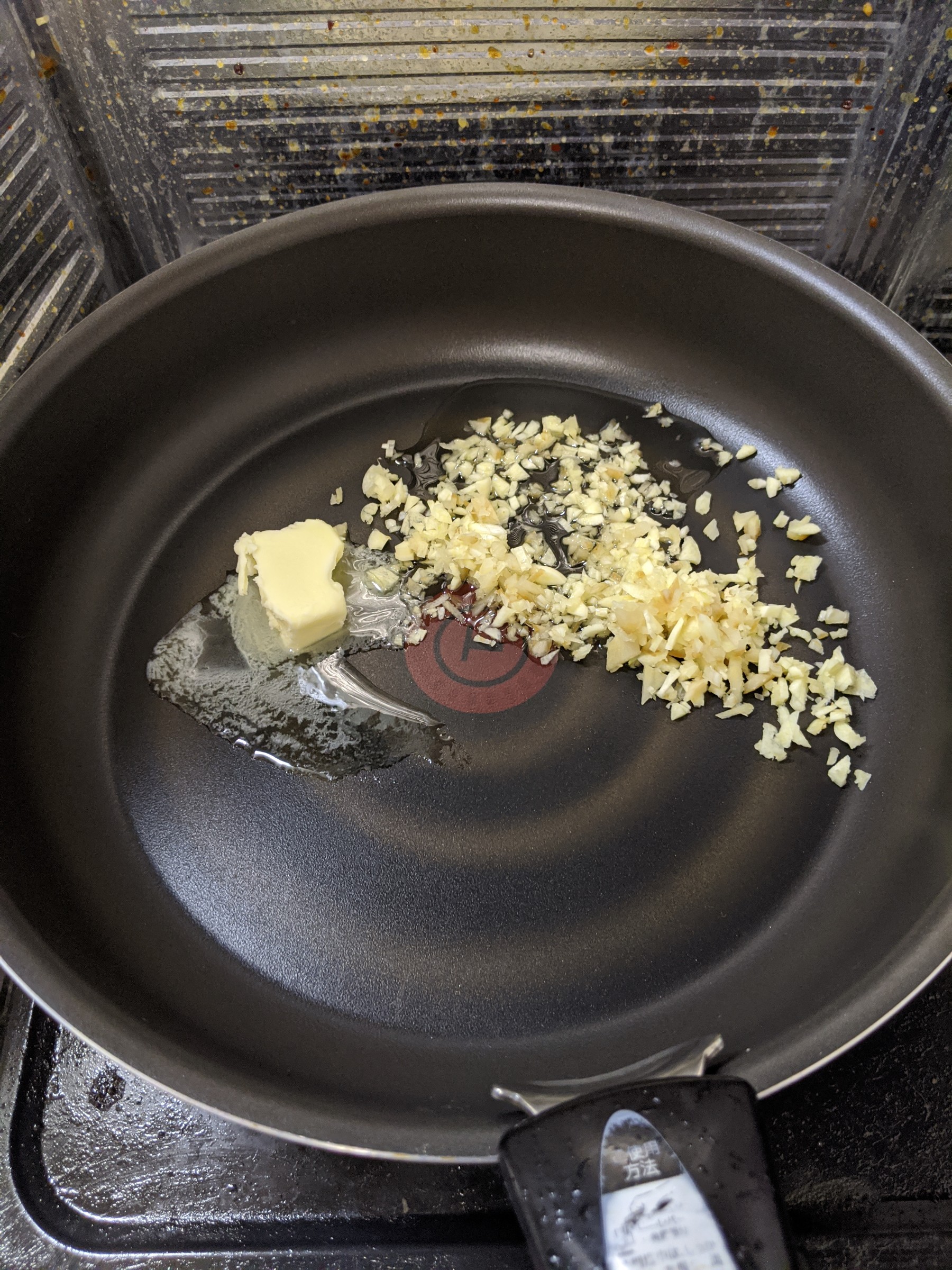 まずはみじん切りにしたニンニクと生姜を、サラダ油とバターで炒めていきます。