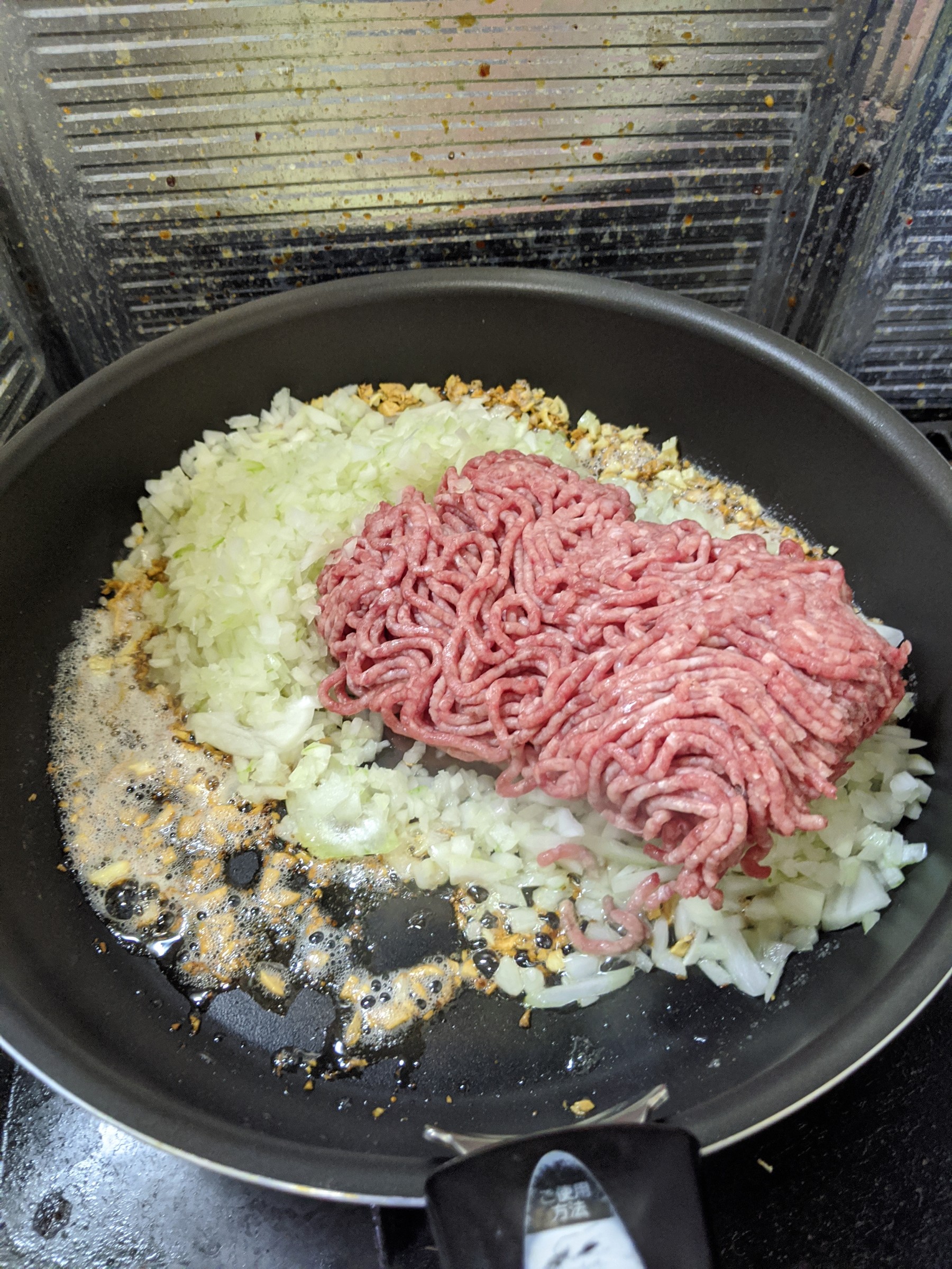 色が変わってきたら、これまたみじん切りの玉ねぎと挽き肉を炒めていきます。