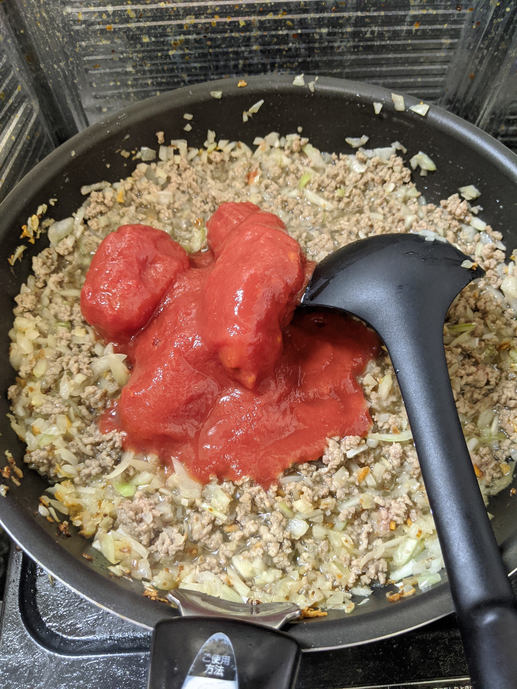 挽き肉全体に火が通ったら、トマト缶を投入して潰しながら炒めます。
