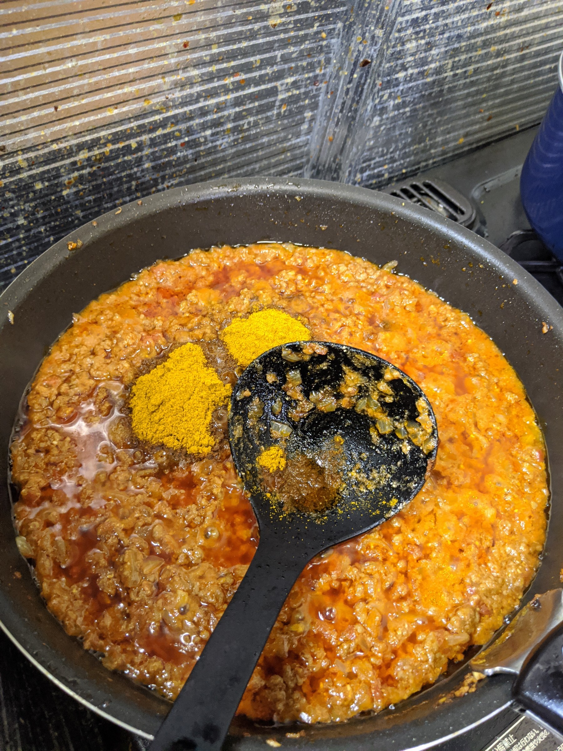 ある程度水を飛ばしたら、カレー粉を大さじ2杯です。