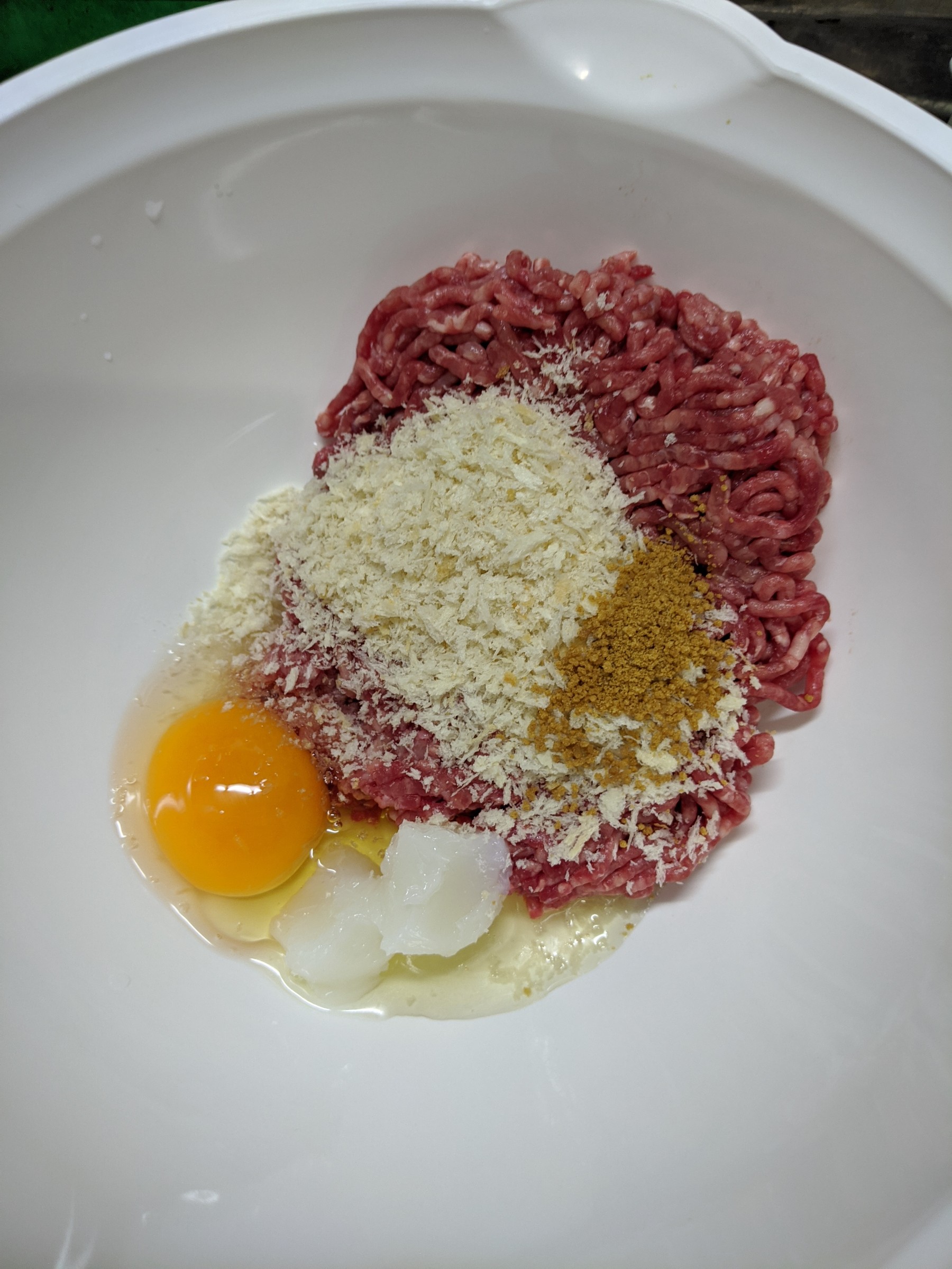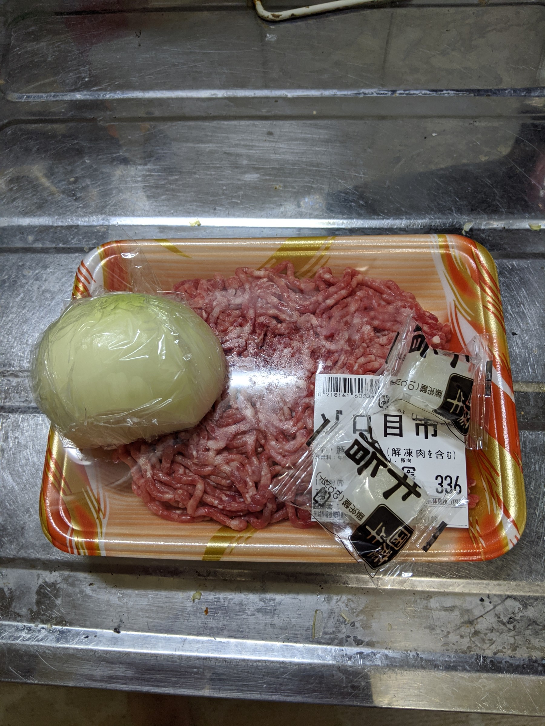 使うのは玉ねぎと牛豚合挽き肉と卵とパン粉、変わったところで牛脂を使います!