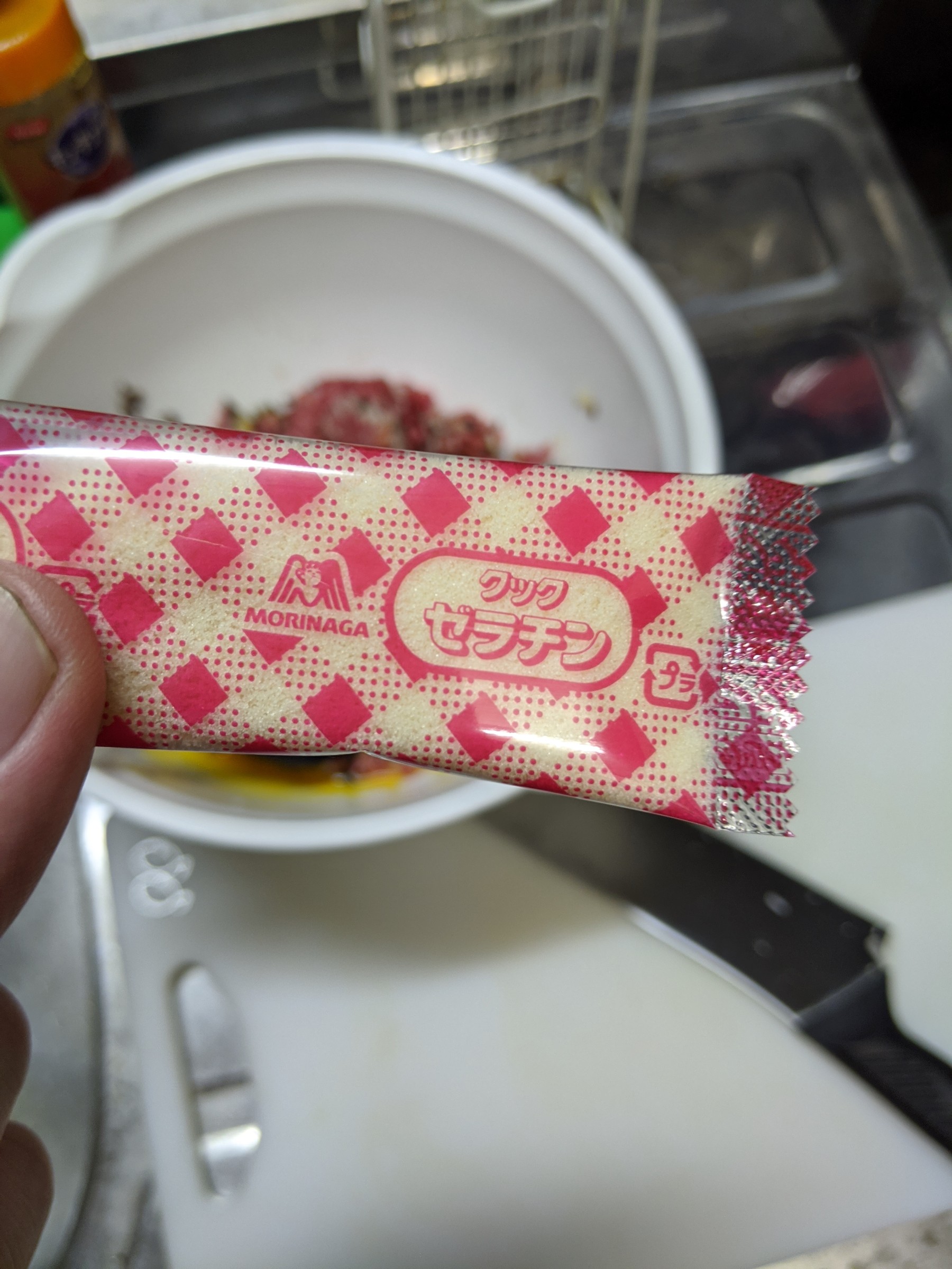 断面を見てみると、肉汁が内部に留まっているのが分かります。これが粉ゼラチンの効果なのですね。