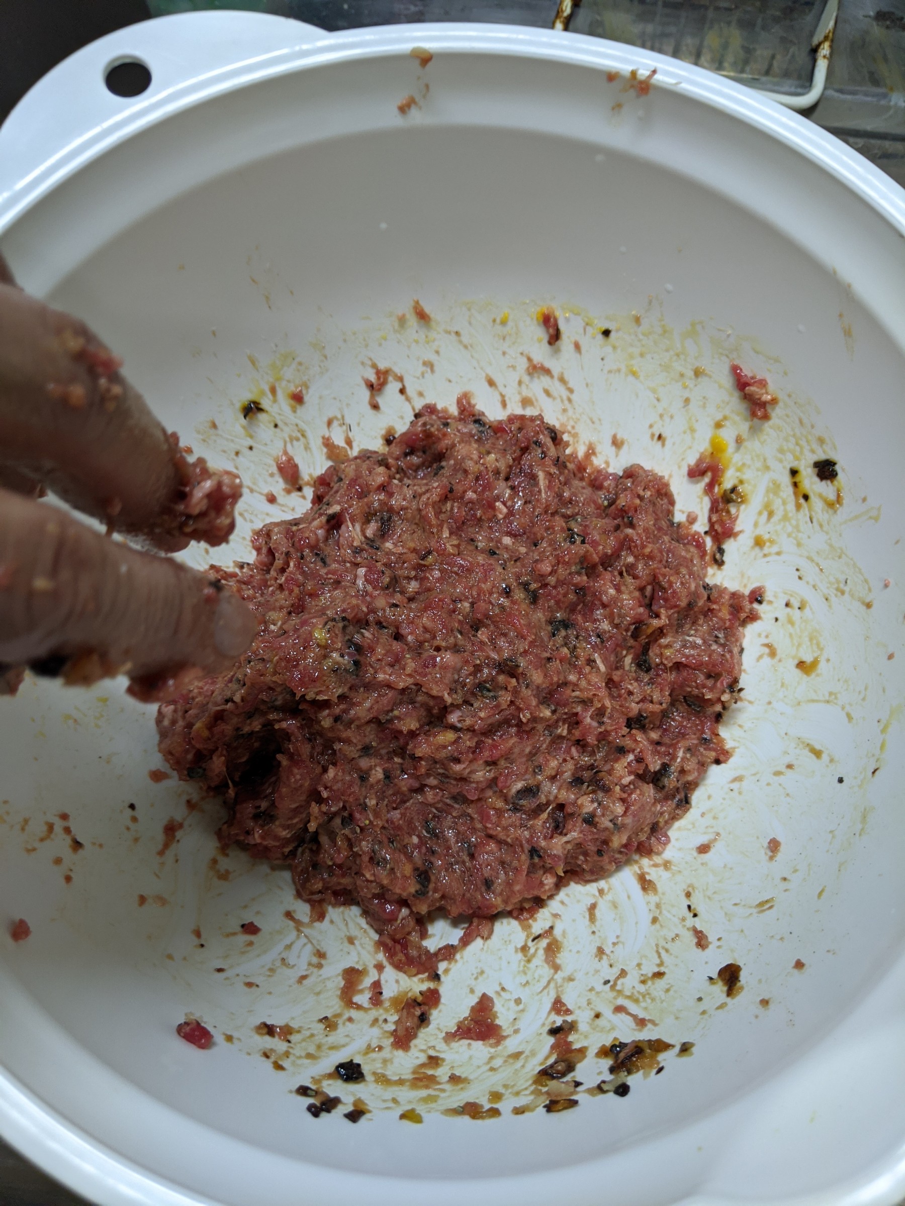 挽き肉と卵、牛脂とパン粉を混ぜ込んでいきます。