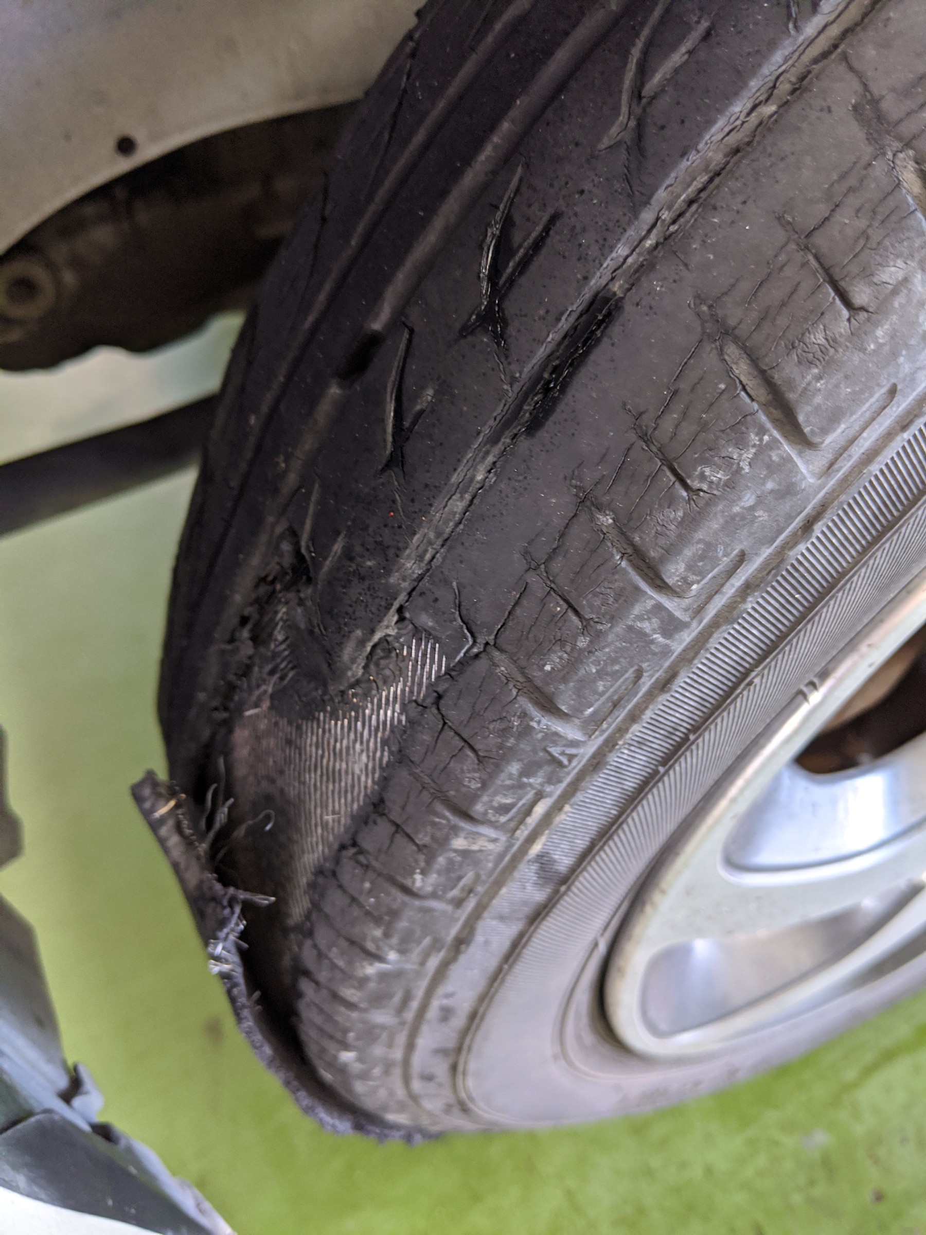 これは、タイヤの接地面が剥がれてしまっている、極めて危険な状態です。