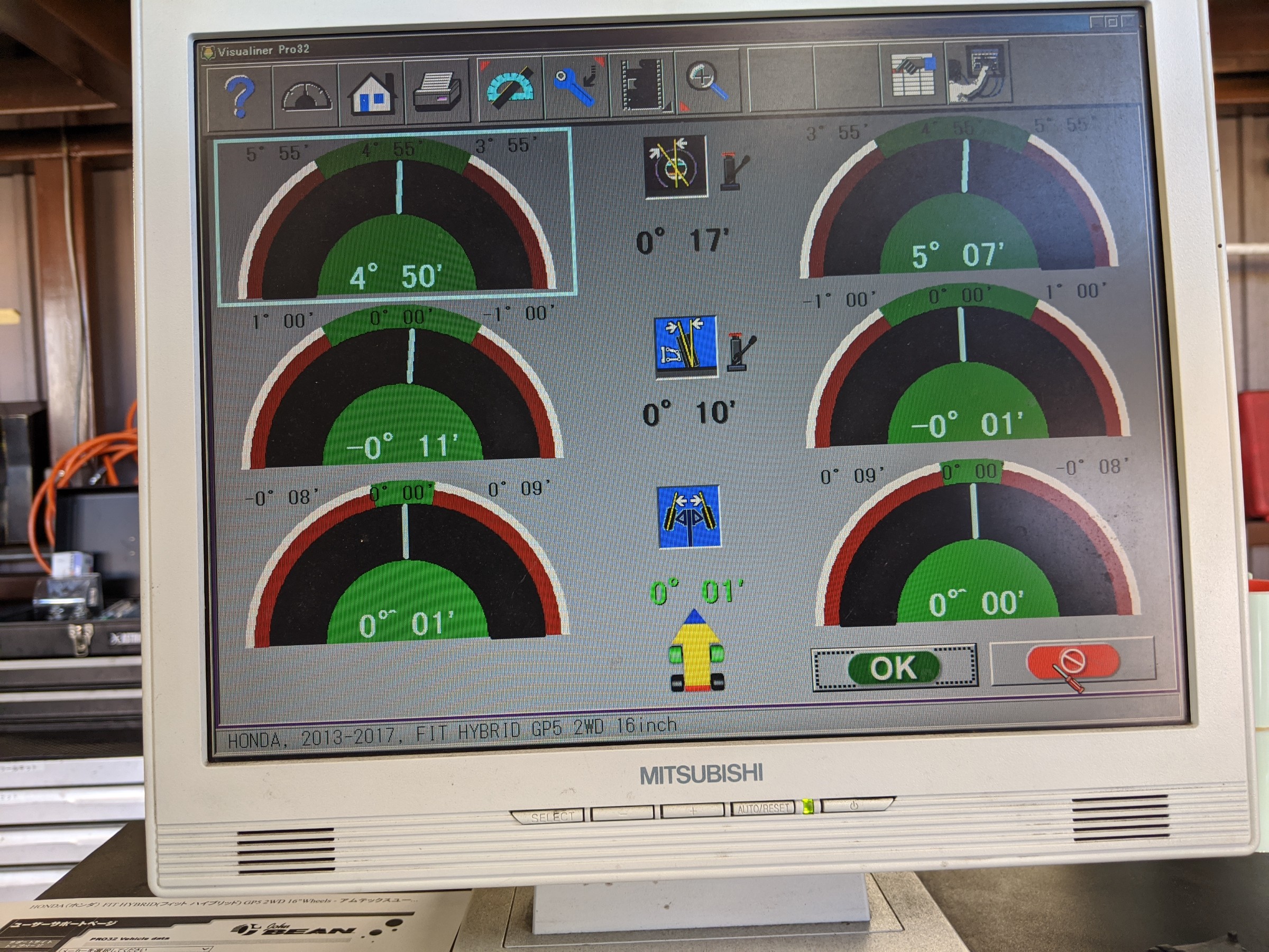前輪トーを、つまりタイヤの向きをキッチリ基準値に合わせます。