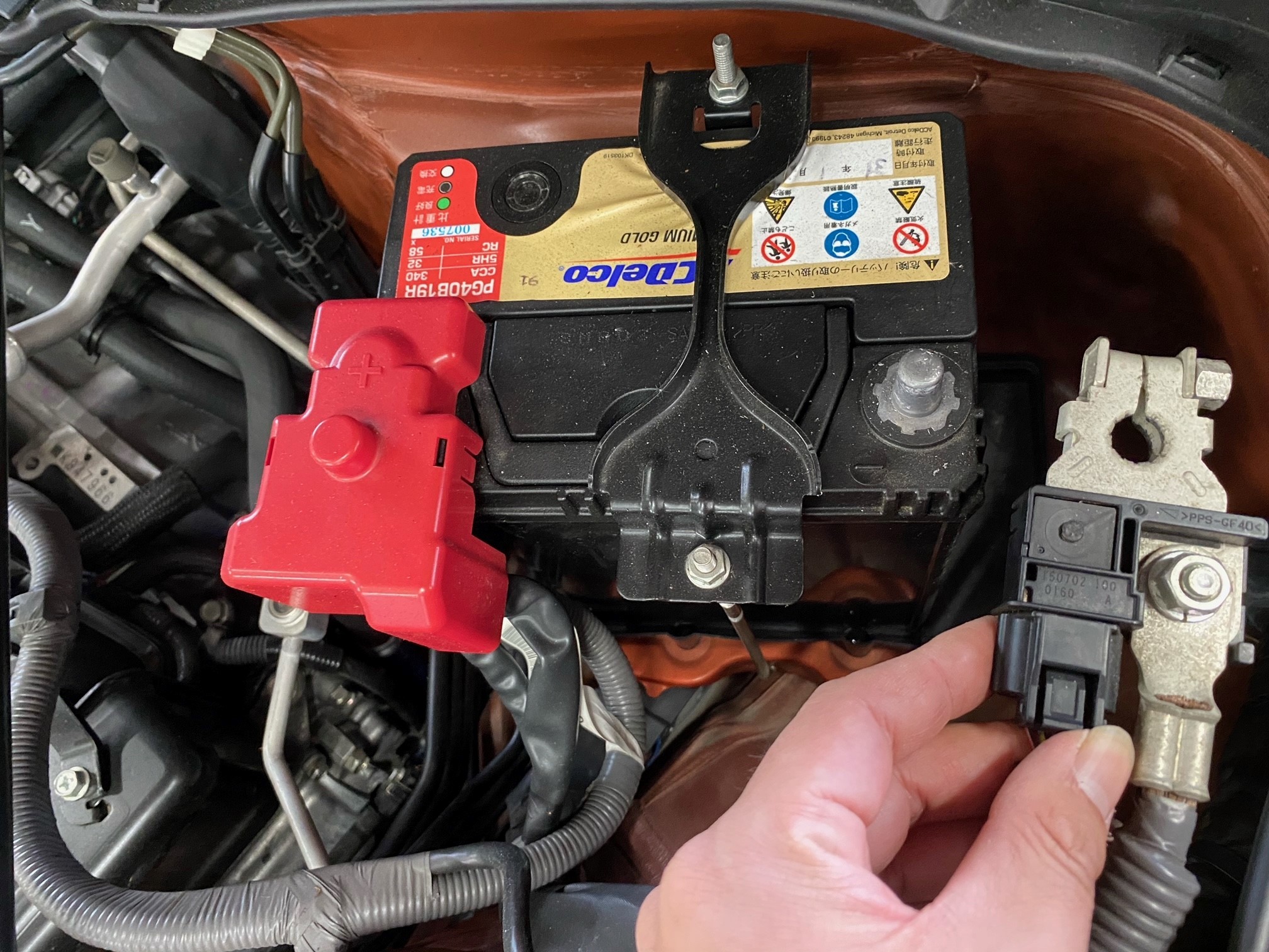 作業はまずバッテリーのー端子を外します。