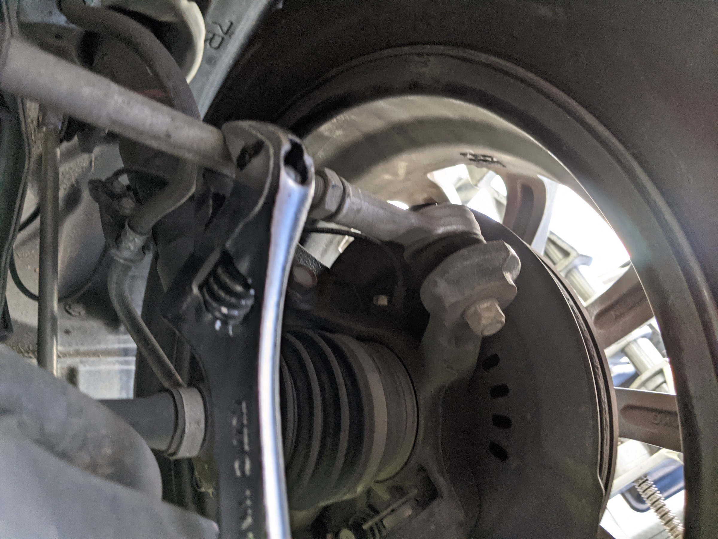 タイロッドで前輪タイヤの角度を調整し、基準値に合わせていきます。
