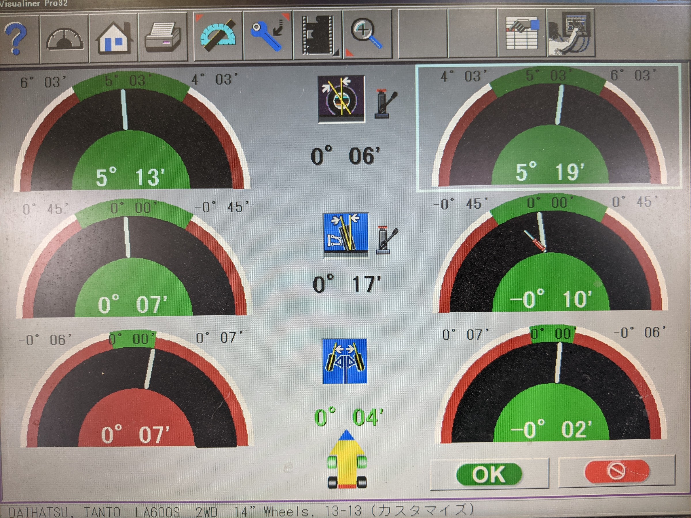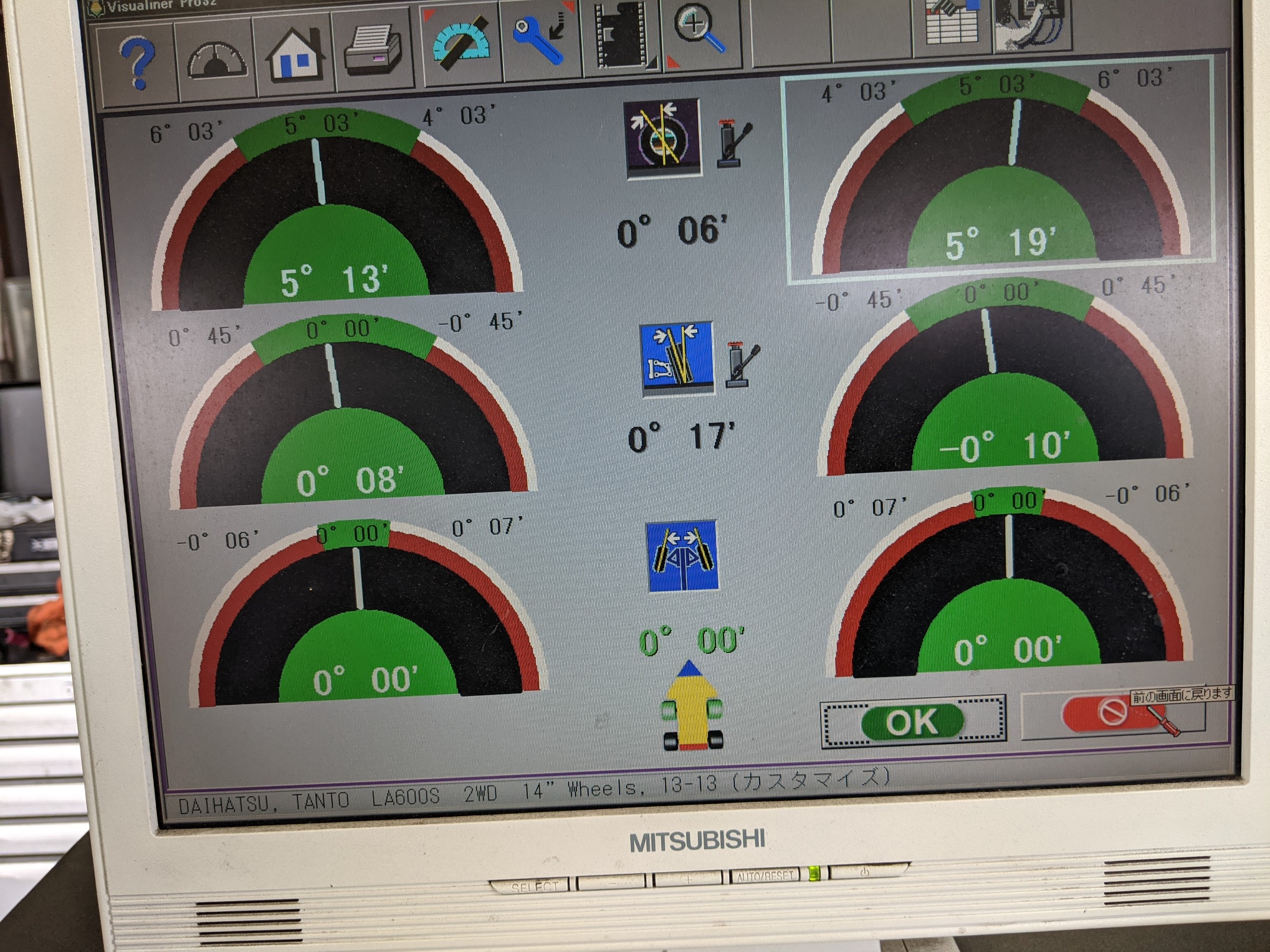 結果はやはり、左前のタイヤが基準値を超えて内側を向いていることがわかりました!