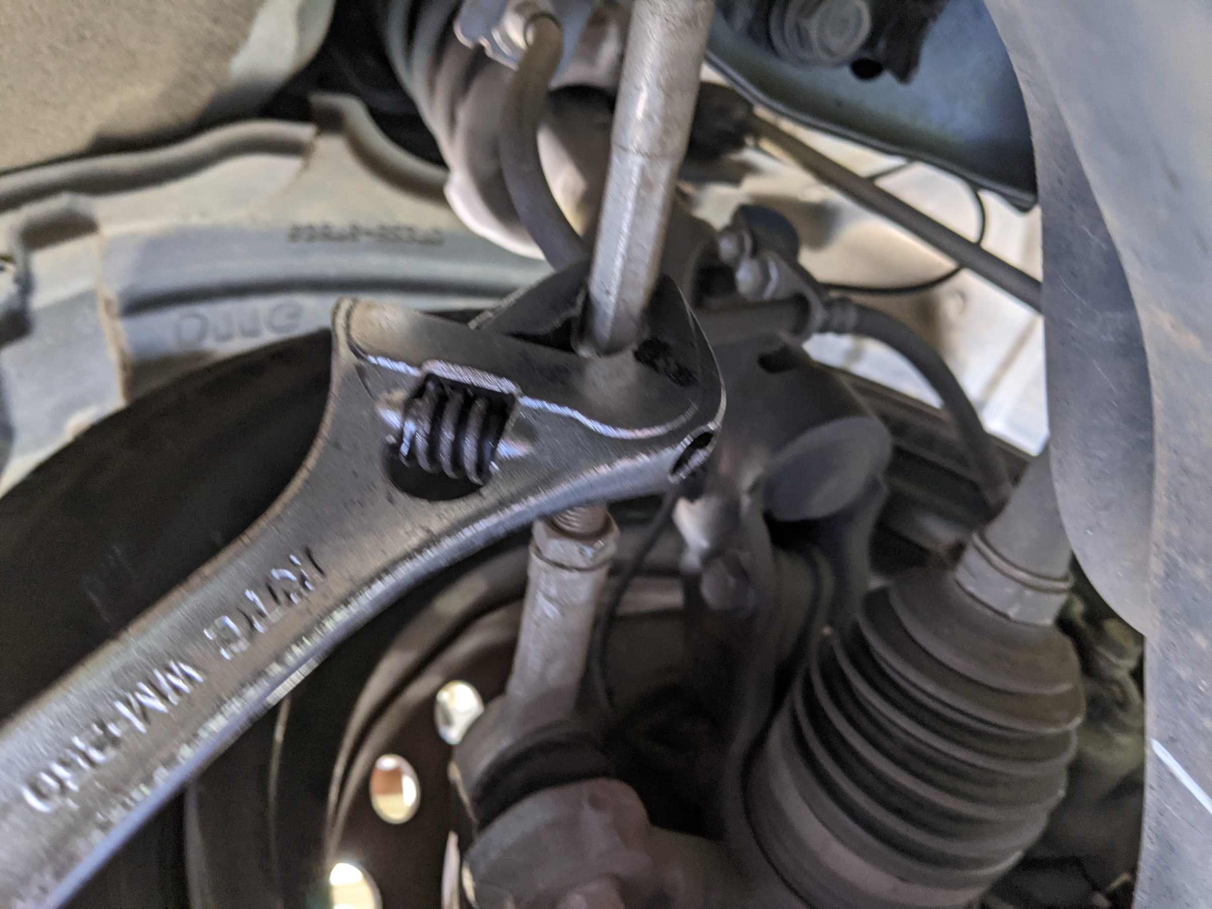 車体下に潜り、タイロッドをひねって角度を調整していきます。