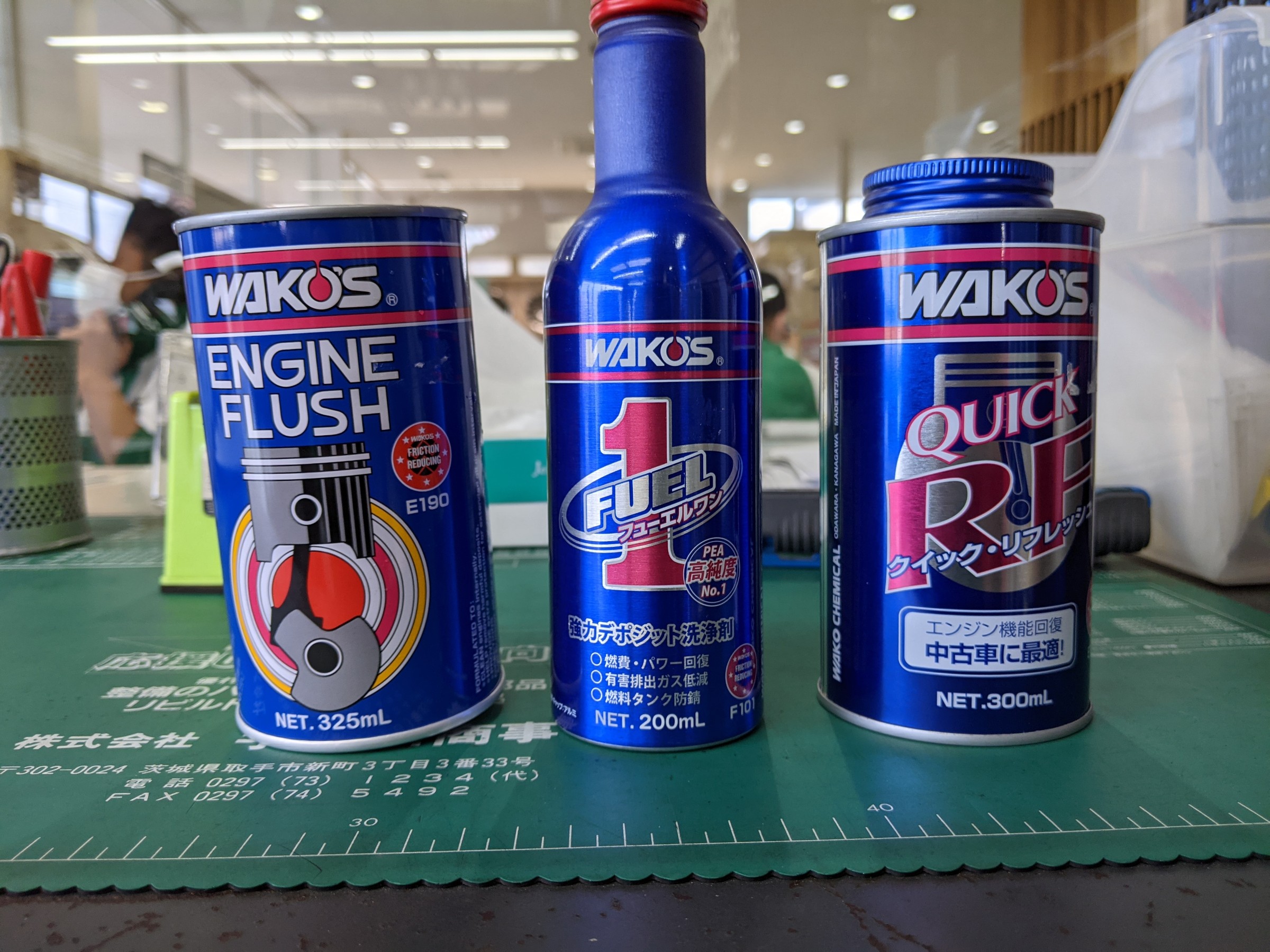 左はエンジンフラッシュというフラッシング剤、真ん中は燃料系からエンジン洗浄をする添加剤、右はエンジンオイルに混ぜて入れる添加剤です!