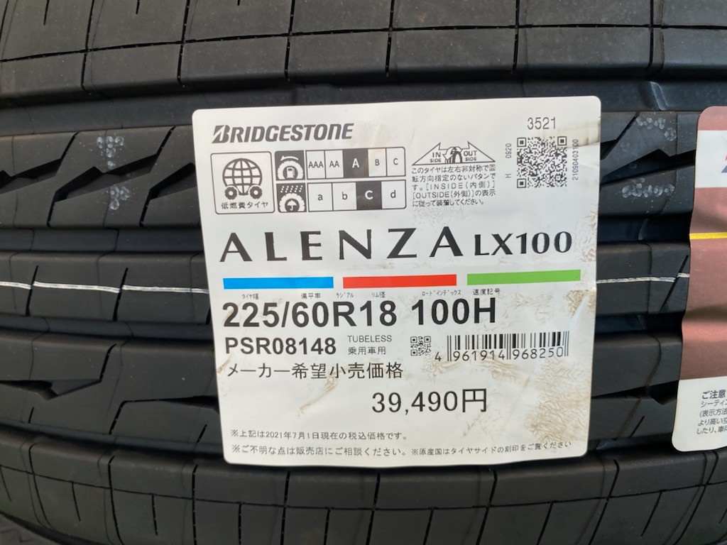 ALENZA LX100サイズ:225/60R18 こちらのタイヤは、SUV専用タイヤで、静粛性・耐摩耗性・ふらつきを小さくするなど性能が備わっています。他のタイヤには無い快適さがありとてもいいタイヤにになっております。