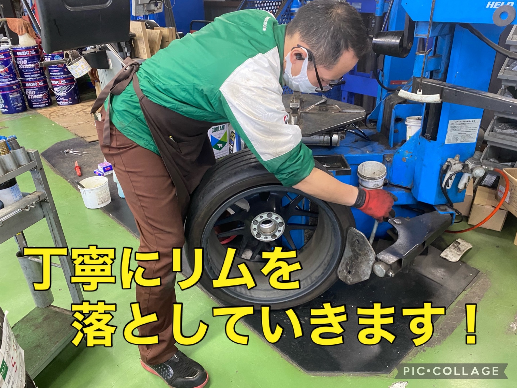 丁寧にリム部分をビードブレーカーで落としていきます!