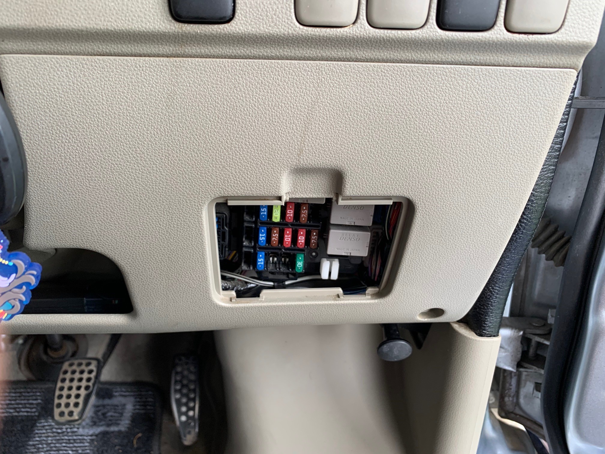 続いてフロントカメラを取り付けしていくのですが、まず最初に電源確保するためにヒューズを探していきます!アトレーは運転席の右膝あたりにカバーが付いていてカバーを外すとすぐ目の前に現れます!