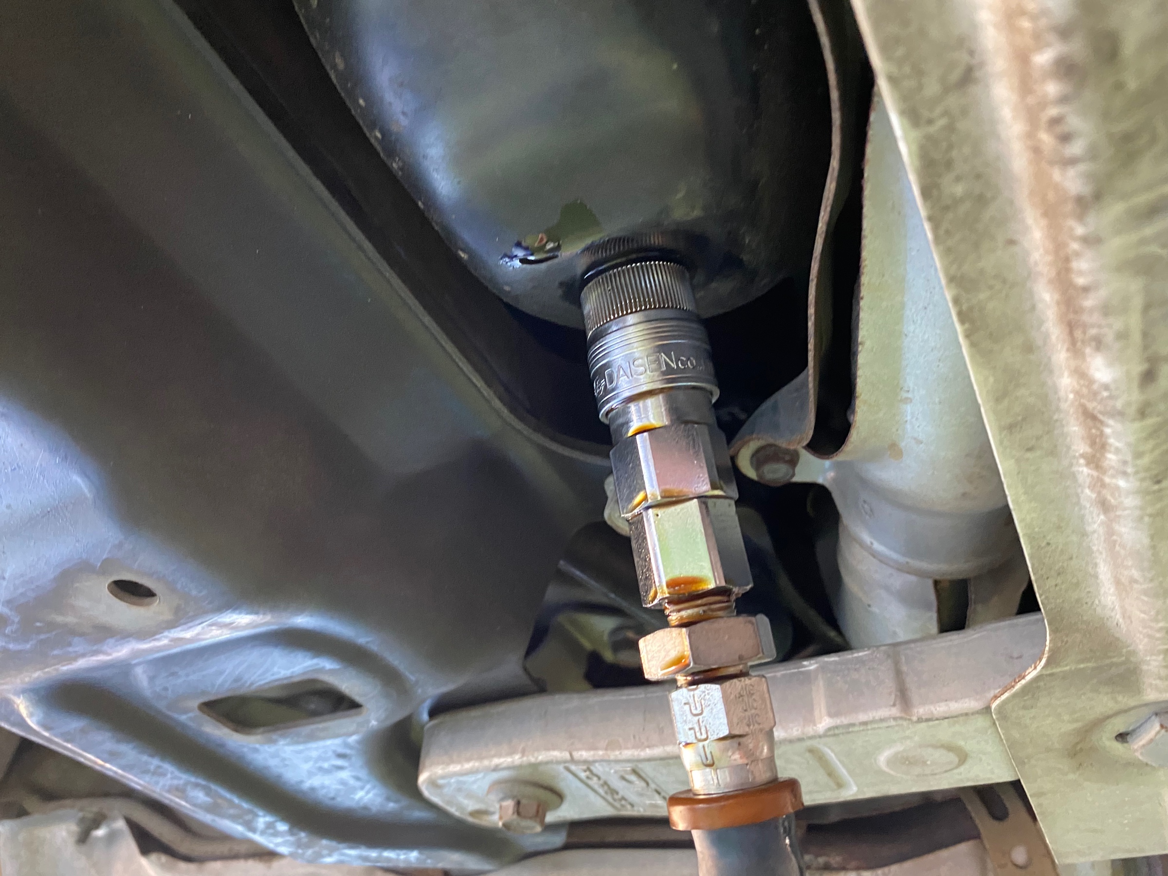 まずはオイルフィルターを外してここにホースを繋ぎ、下のオイルパンのドレンにもホースを繋いでいきます。