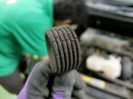 この音と写真のようにひび割れて痩せてしまっていたり、溝が深くなってしまっていたりすれば交換となりますので、音がしたらまずはベルトを点検してもらいましょう。