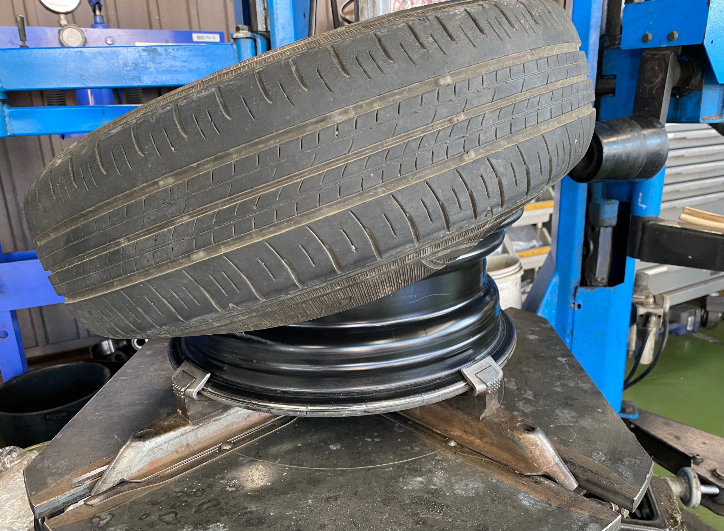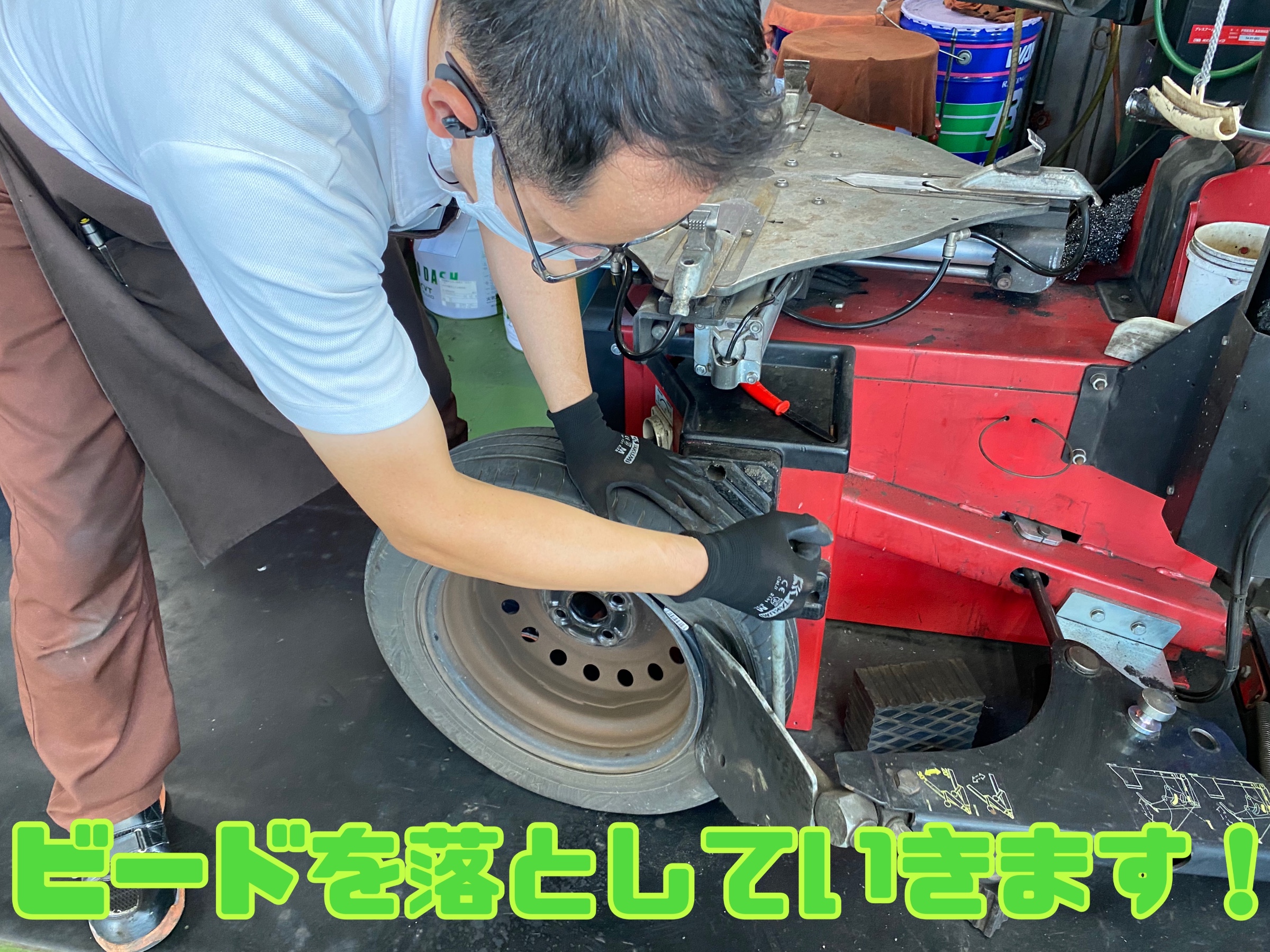 タイヤを交換する際は、ビード(リムにかん合する部分)を落としていきます。