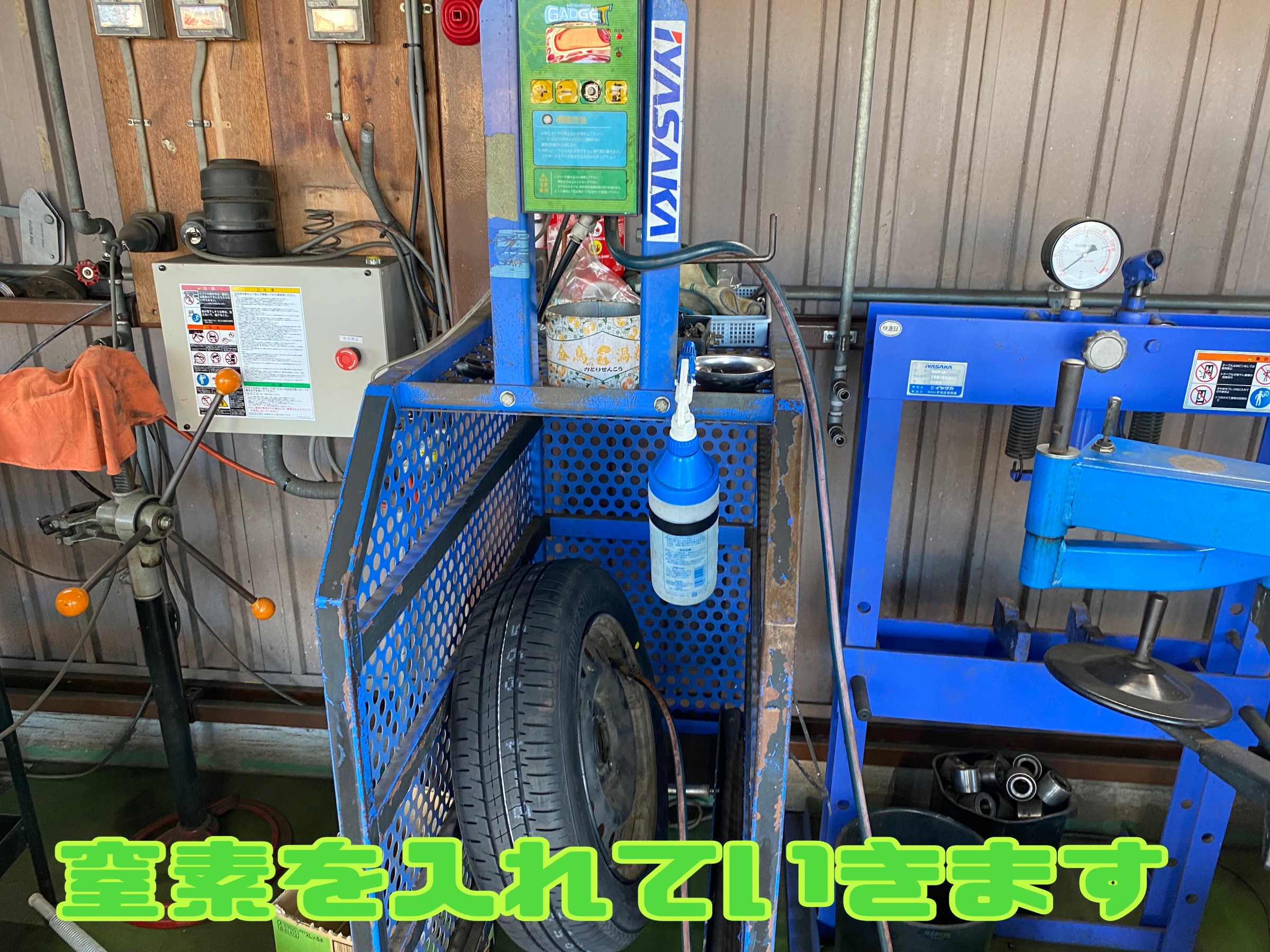 タイヤをつけたら空気を入れていきます!タイヤが爆発しないようこのようなガードのあるものを使っていきます。