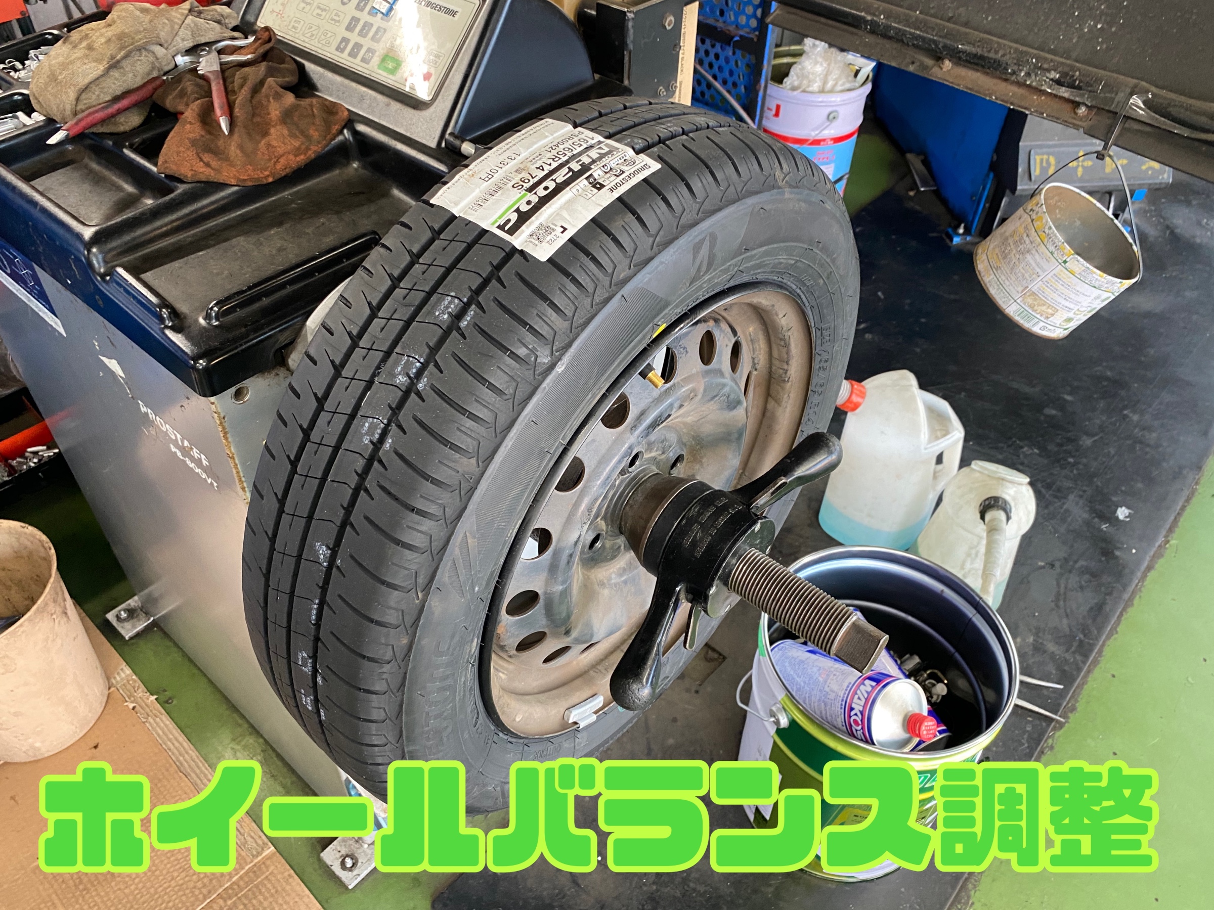 続いては、ホイールバランス調整です。ホイールバランスとは、ホイールにタイヤを組んで空気を入れた状態の質量のつり合いのことでこの部分がずれているとハンドルがぶれたり片摩耗の原因に繋がります。