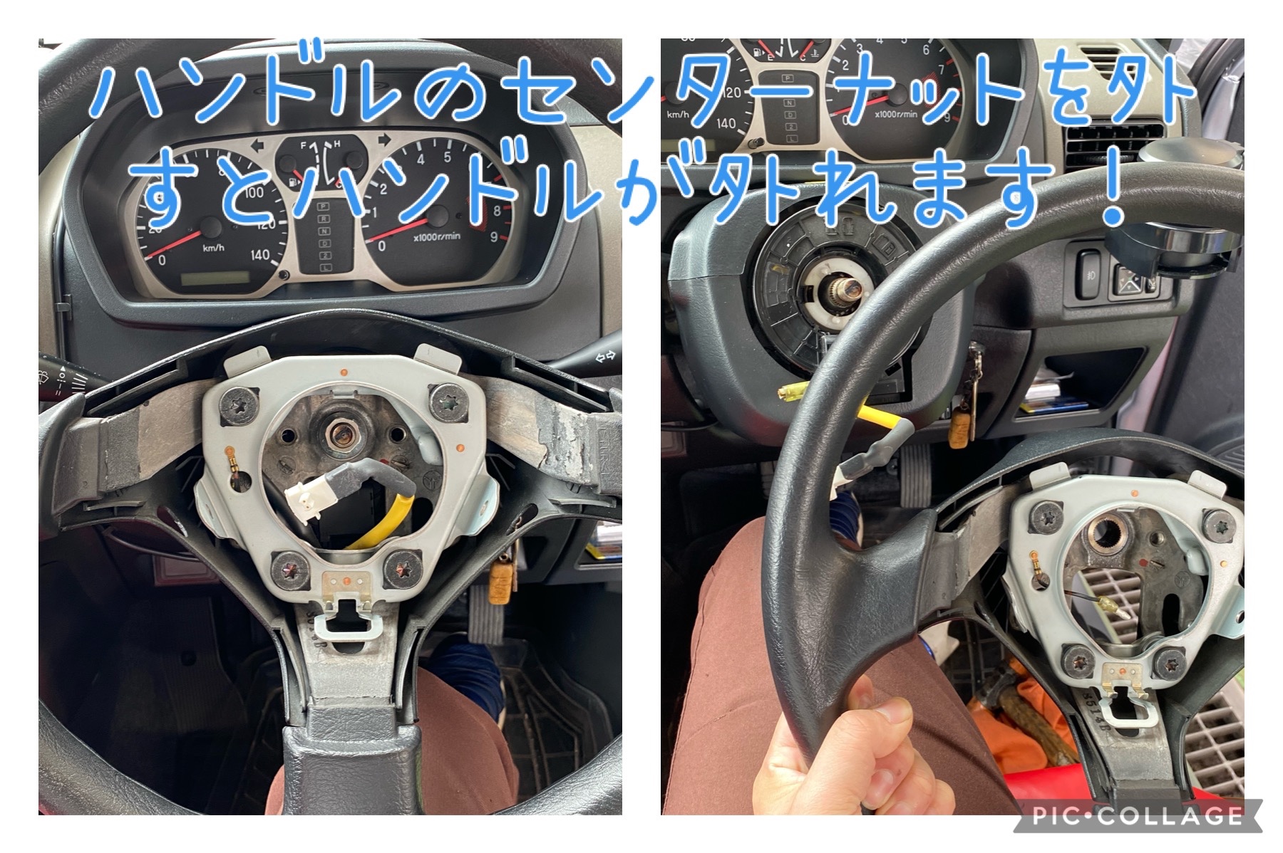 エアバックが外れたらセンターのナットを外すとこのように外れます。ホーンのアースが付いてるので切らないように先に外しときましょう。