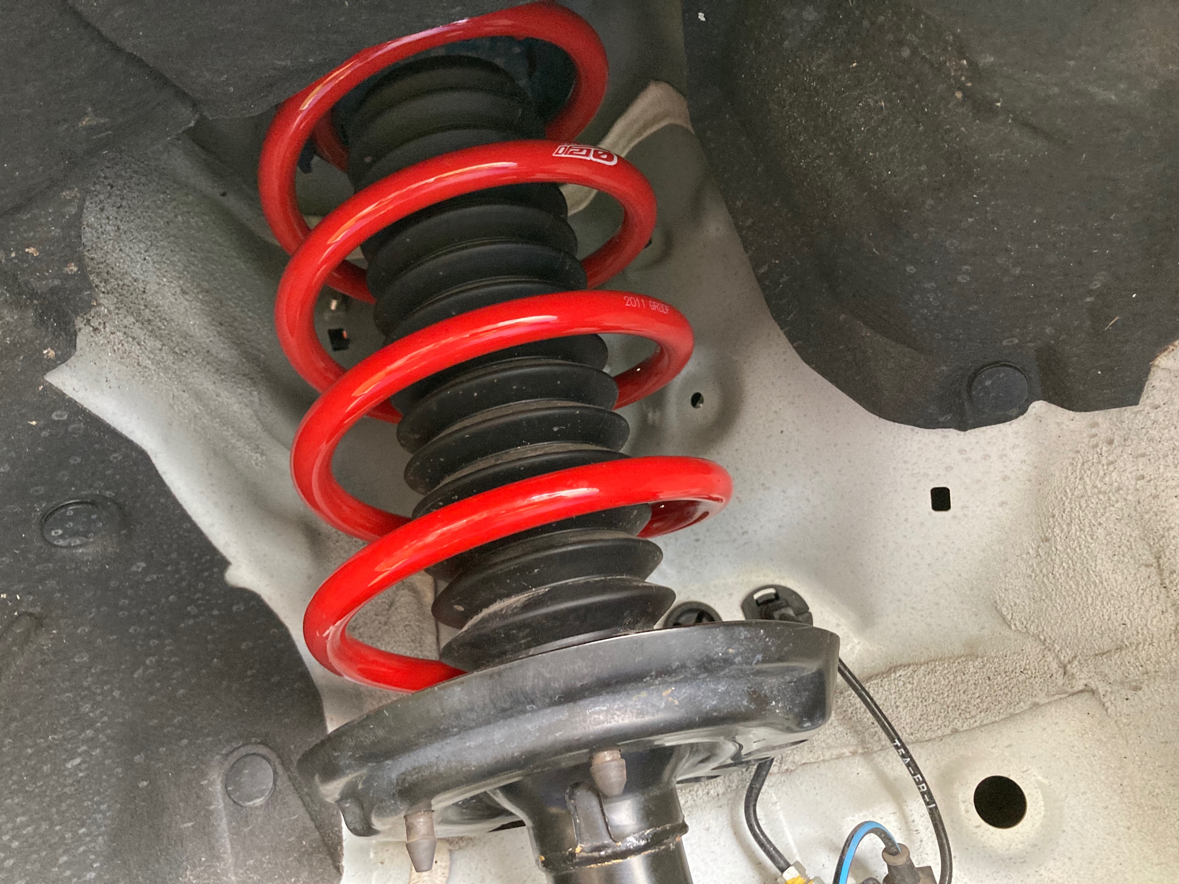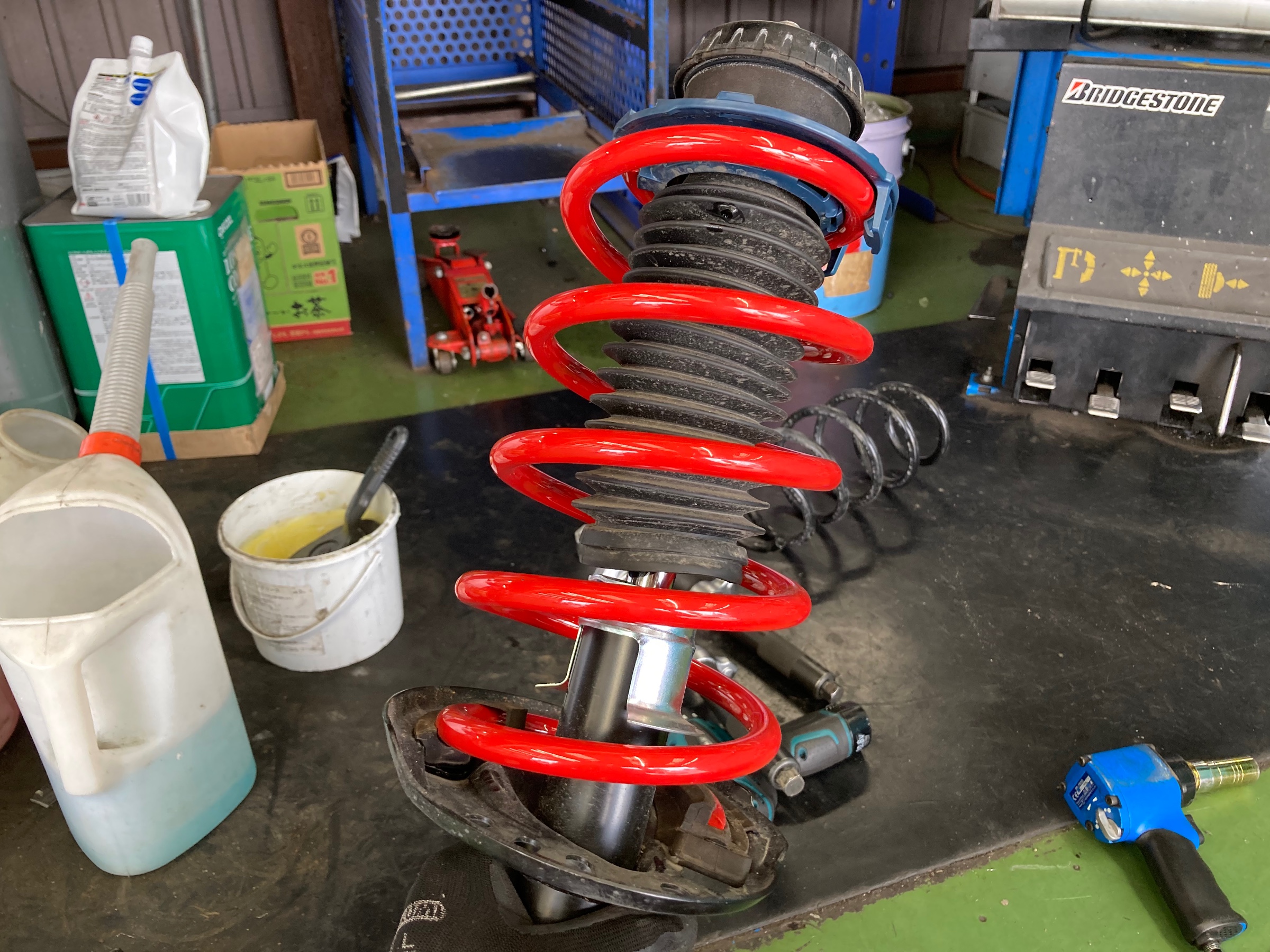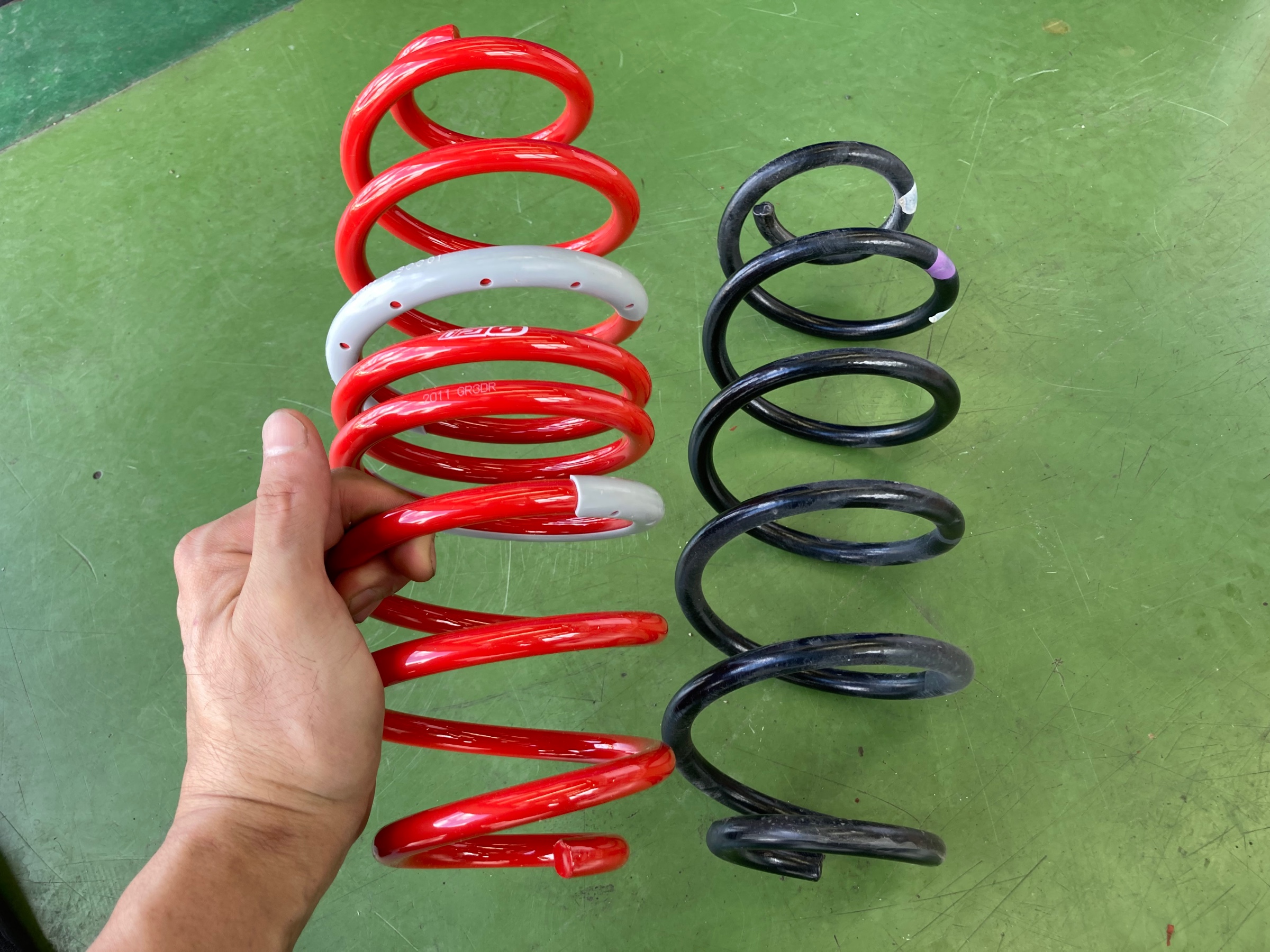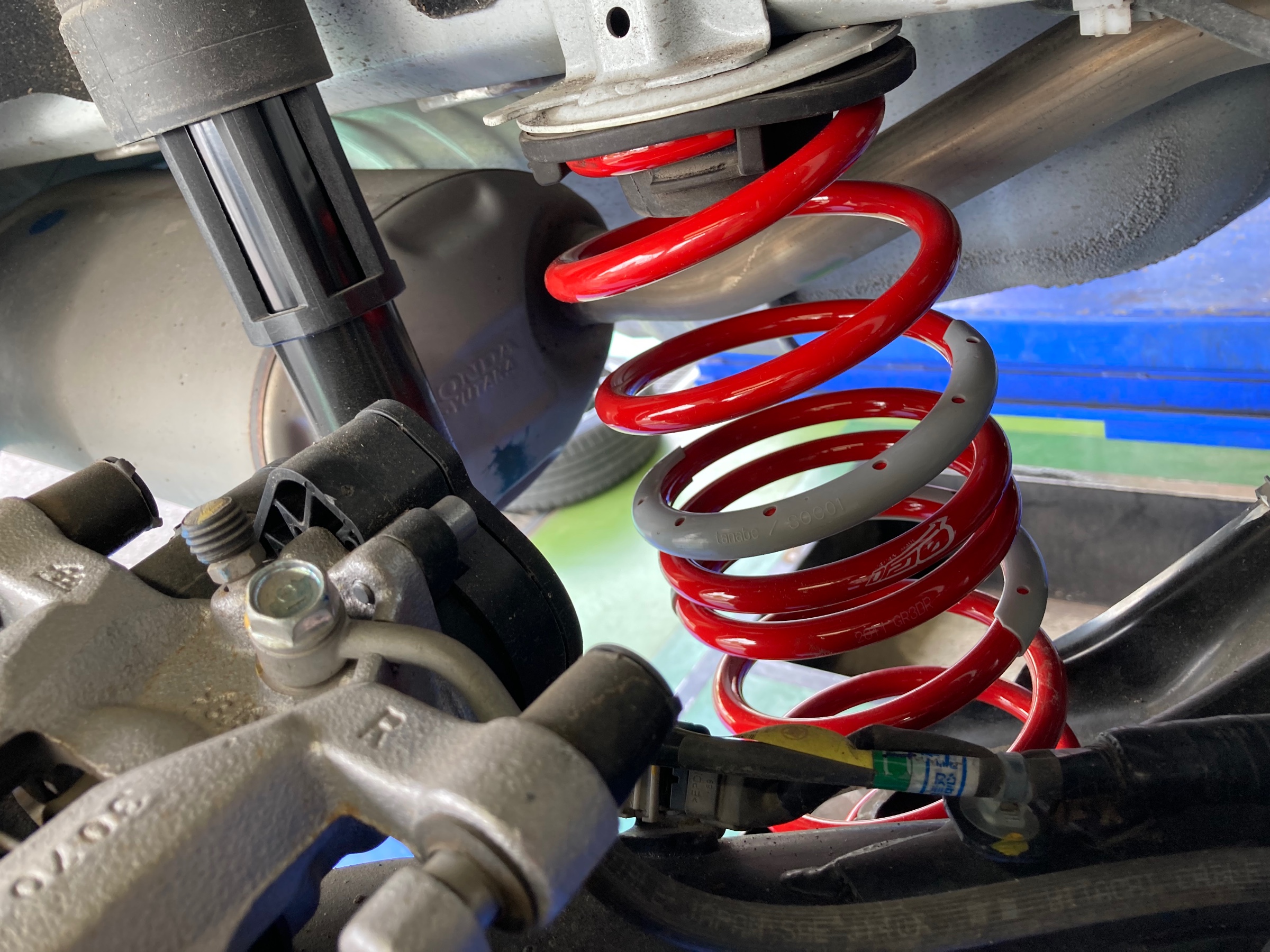 無事前後の交換作業が完了。目に鮮やかなレッドの塗装がタナベローダウンスプリングの特徴ですね。