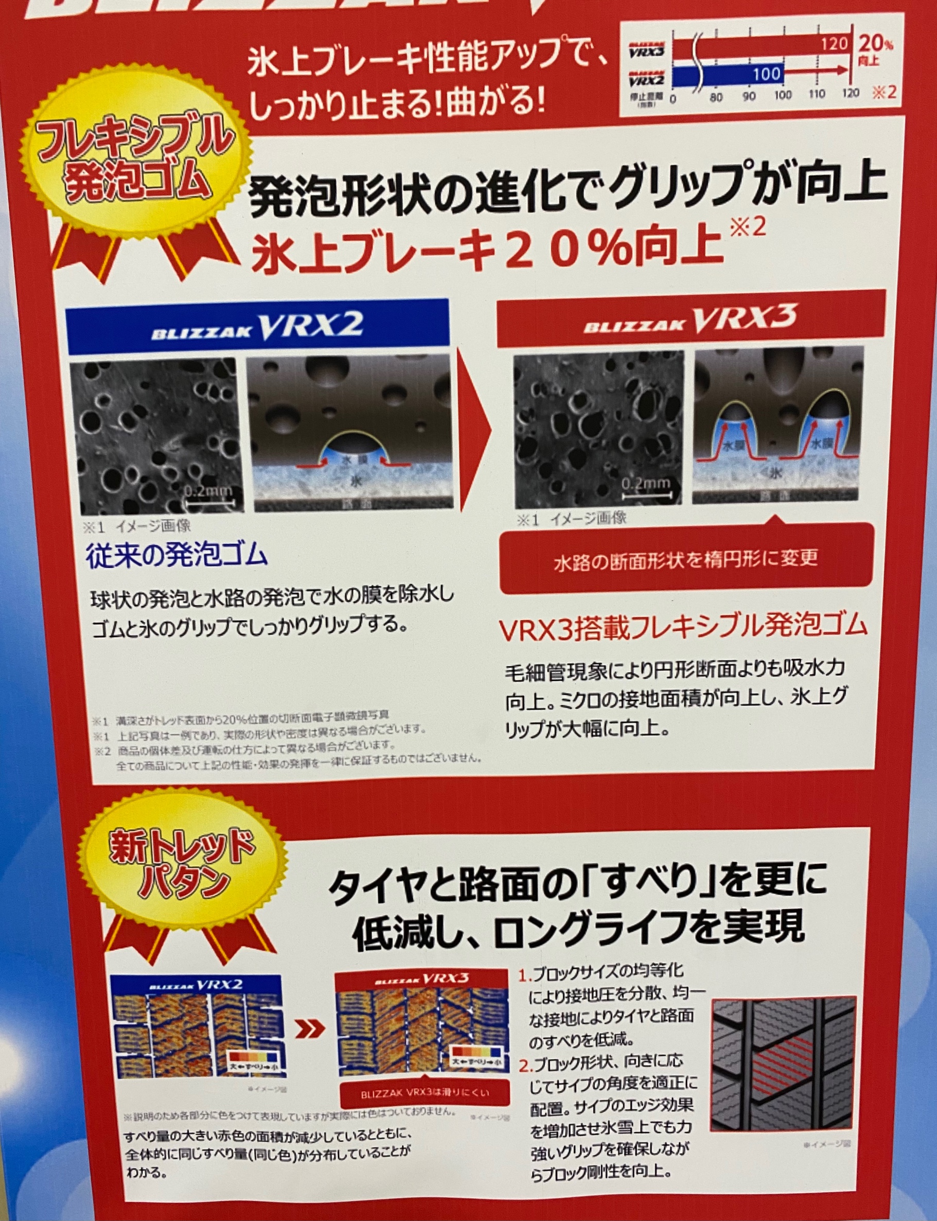 VRX3になって更にブリザックも進化し続けています。他には真似できない発泡ゴムなどブリザックならではの特徴もあるので是非気になった方はタイヤ館牛久上柏田店にお越しください!