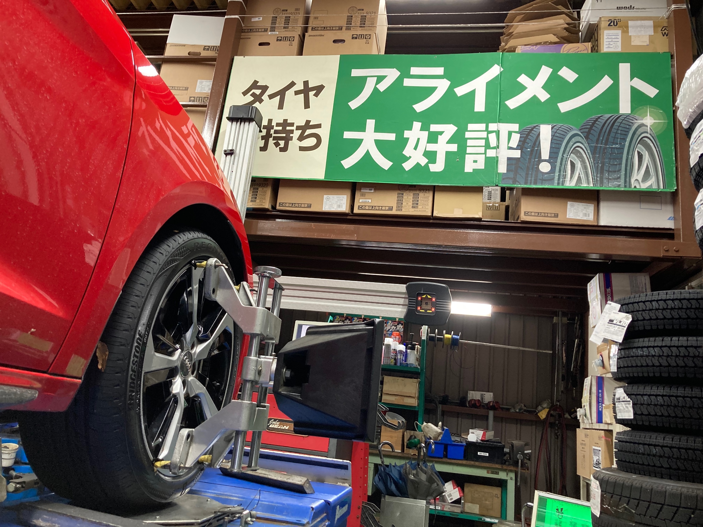 タイヤ交換後には、アライメント調整にてタイヤの取付角度をしっかりと補正。