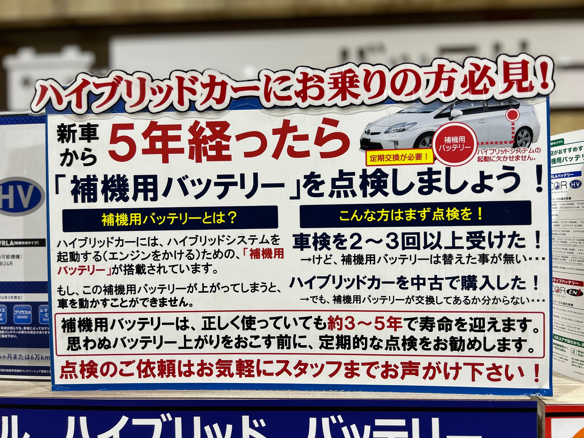 当店では、ガソリン車やアイドリングストップ搭載車、ハイブリッド車など様々なタイプのバッテリーをラインナップしています!点検、交換のご要望は、ぜひ、当店タイヤ館うしく上柏田店スタッフまで、お声かけください!お待ちしております!